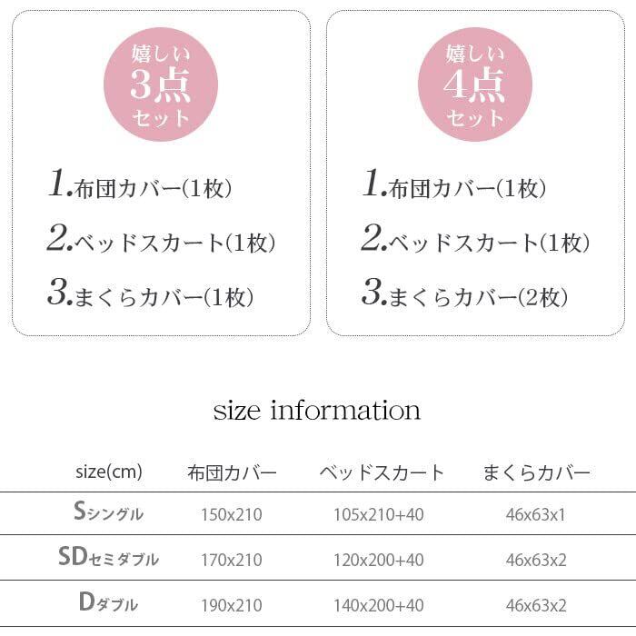 サイズ展開:3点セットシングルサイズ:布団カバー:150cm*210cm ボックスシーツ:105cm*(210+40マチ)cm まくらカバー:46cm*63cm*1点 /4点セットセミダブル:布団カバー:170cm*210cm ボックスシーツ:120cm*(200+40マチ)cm まくらカバー:46cm*63cm*2点/4点セットダブル:布団カバー:190cm*210cm ボックスシーツ:140cm*(200+40マチ)cm まくらカバー:46cm*63cm*2点