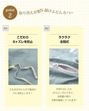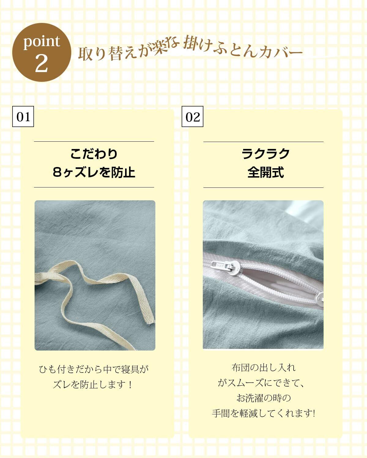 「全開·両開きファスナー式」ファスナーは取手が2つついたダプルスライダータイプのため、掛け布団の着脱もスムーズです。それに、どのサイズもズレ防止用の紐がそれそれ8箇所(4隅、4边の中央)についています。布団とカバーをしっかり固定できて、寝具がズレることなく快適に使える。