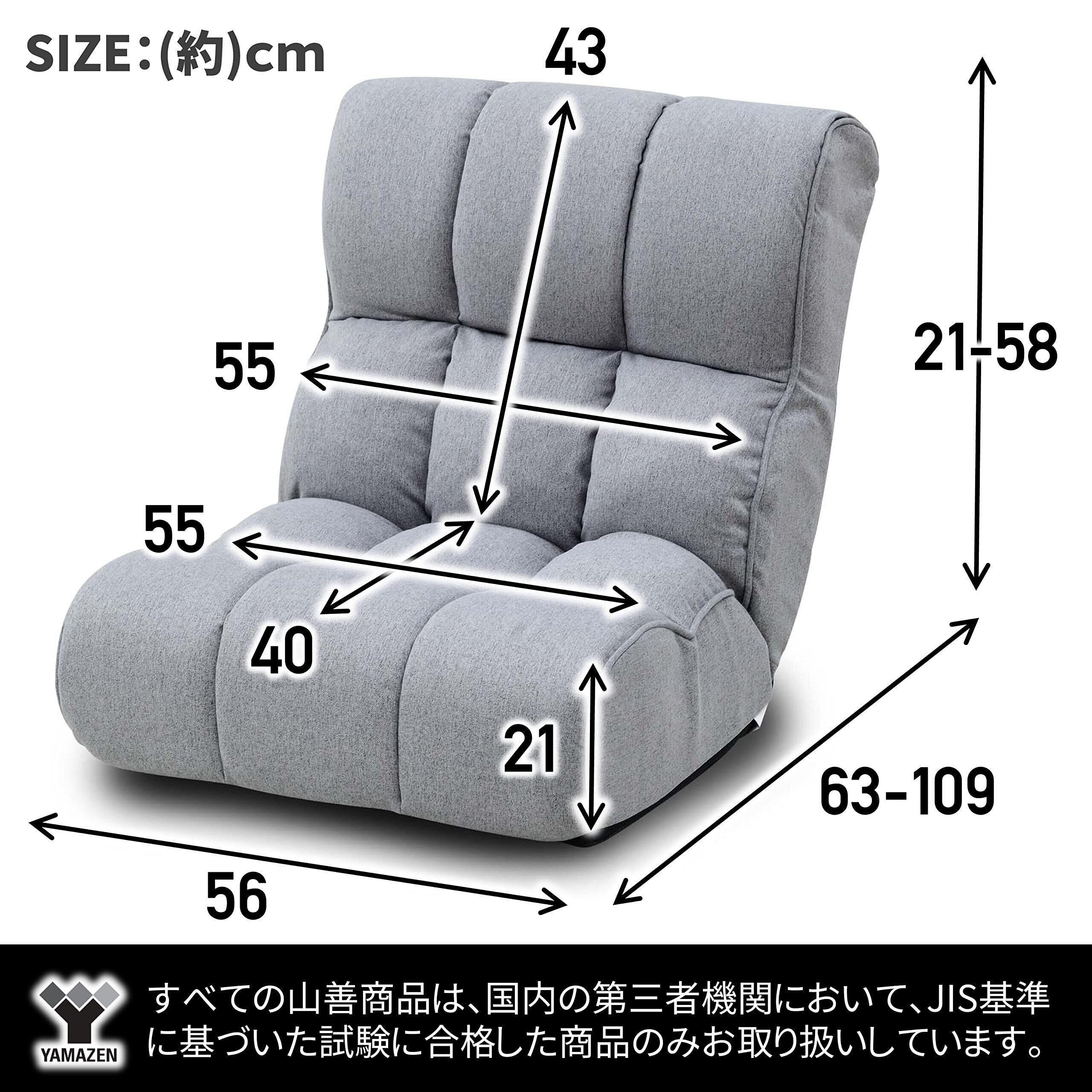 ●本体サイズ:幅56×奥行63-109×高さ21-58㎝●座面サイズ:幅55×奥行40cm●背面サイズ:幅55cm×高さ43cm●厚み:最大21㎝●構造部材:金属(スチール)●張り材:ポリエステル●クッション材:ウレタンフォーム●東証プライム(株)山善で扱うすべての山善商品は、自社もしくは第三者機関において、JIS規格に基づいた品質試験を行っております。