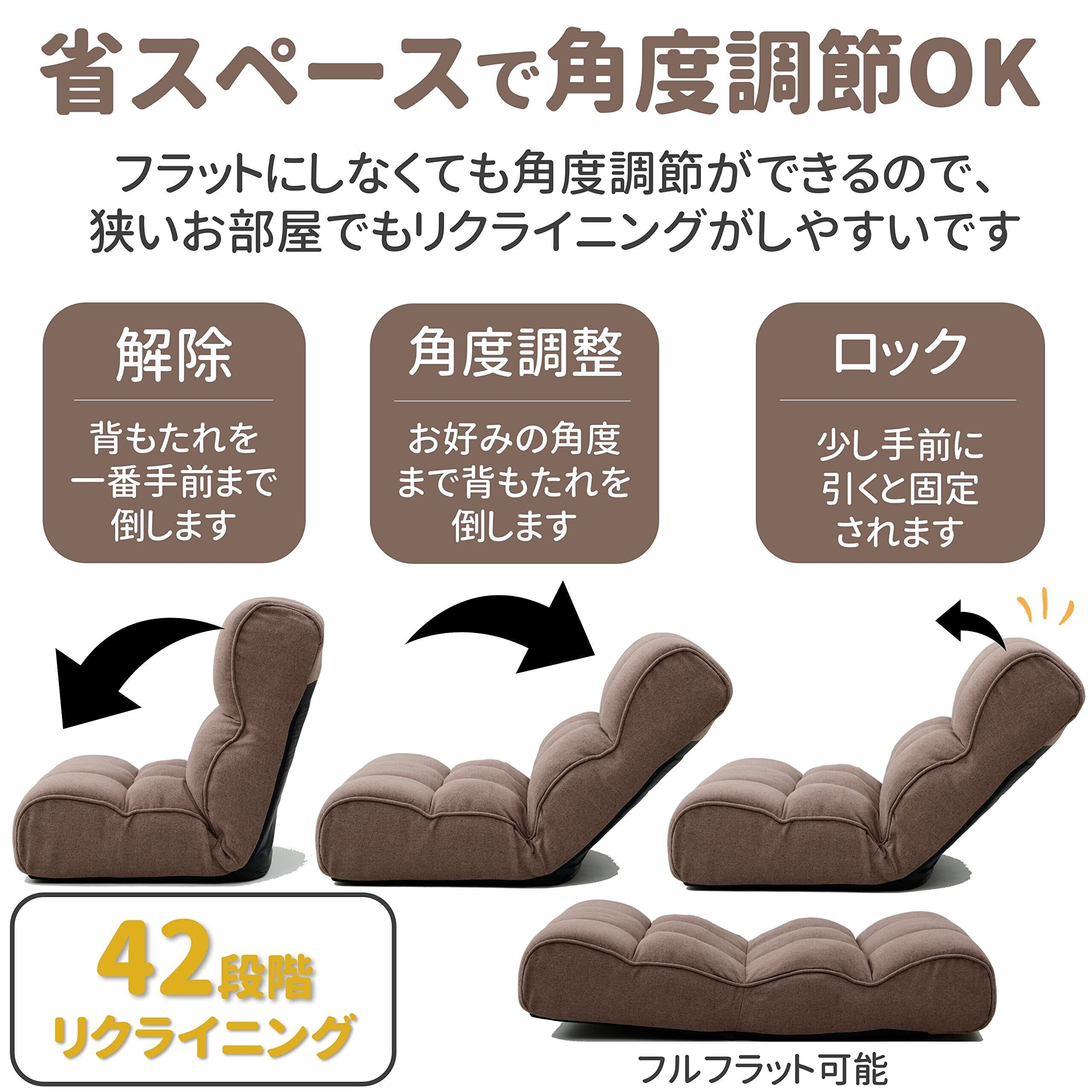 通常の座椅子は一旦フラットにしないと角度調節ができずに場所をとっていましたが、この座椅子はフラットにする必要がないので狭いお部屋でも使いやすいのが特徴です。