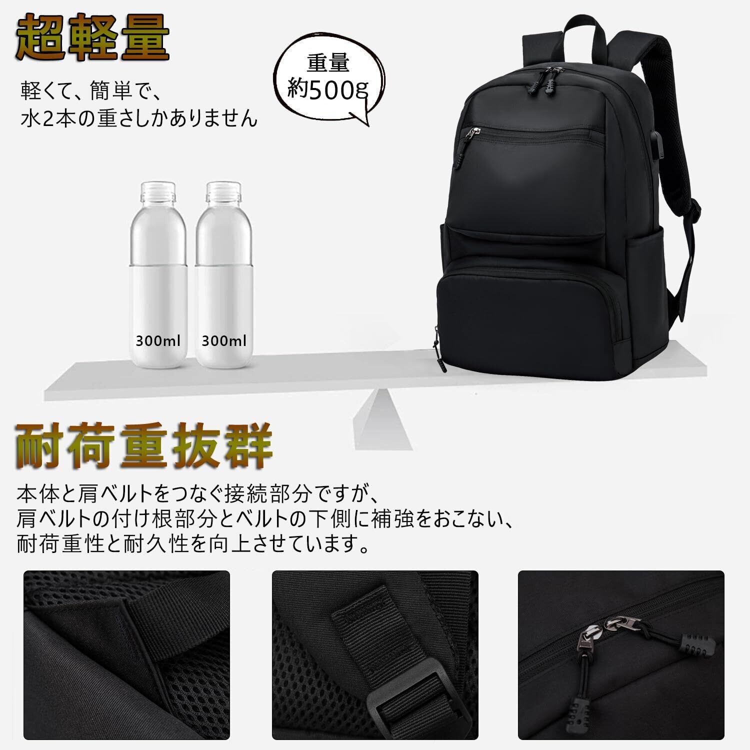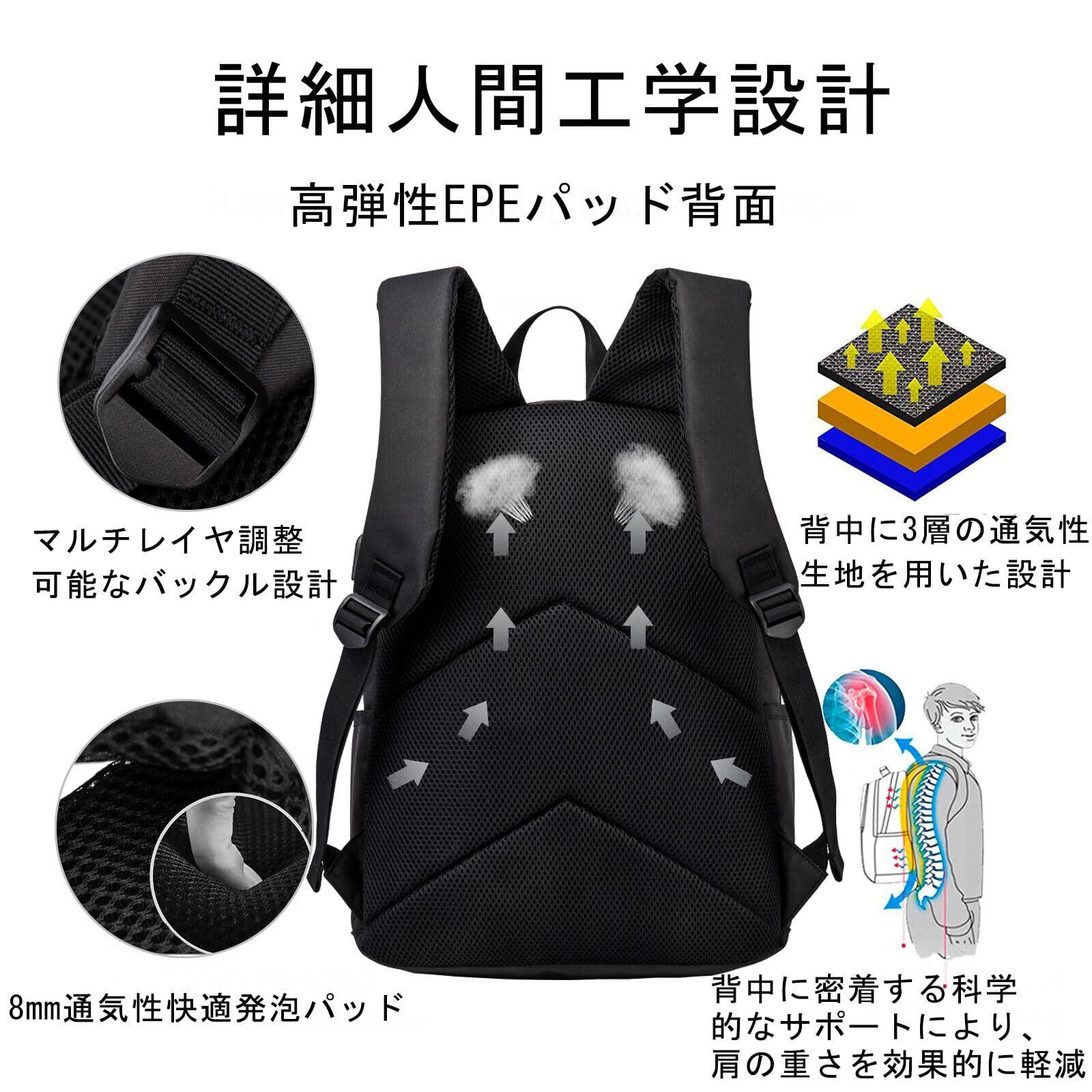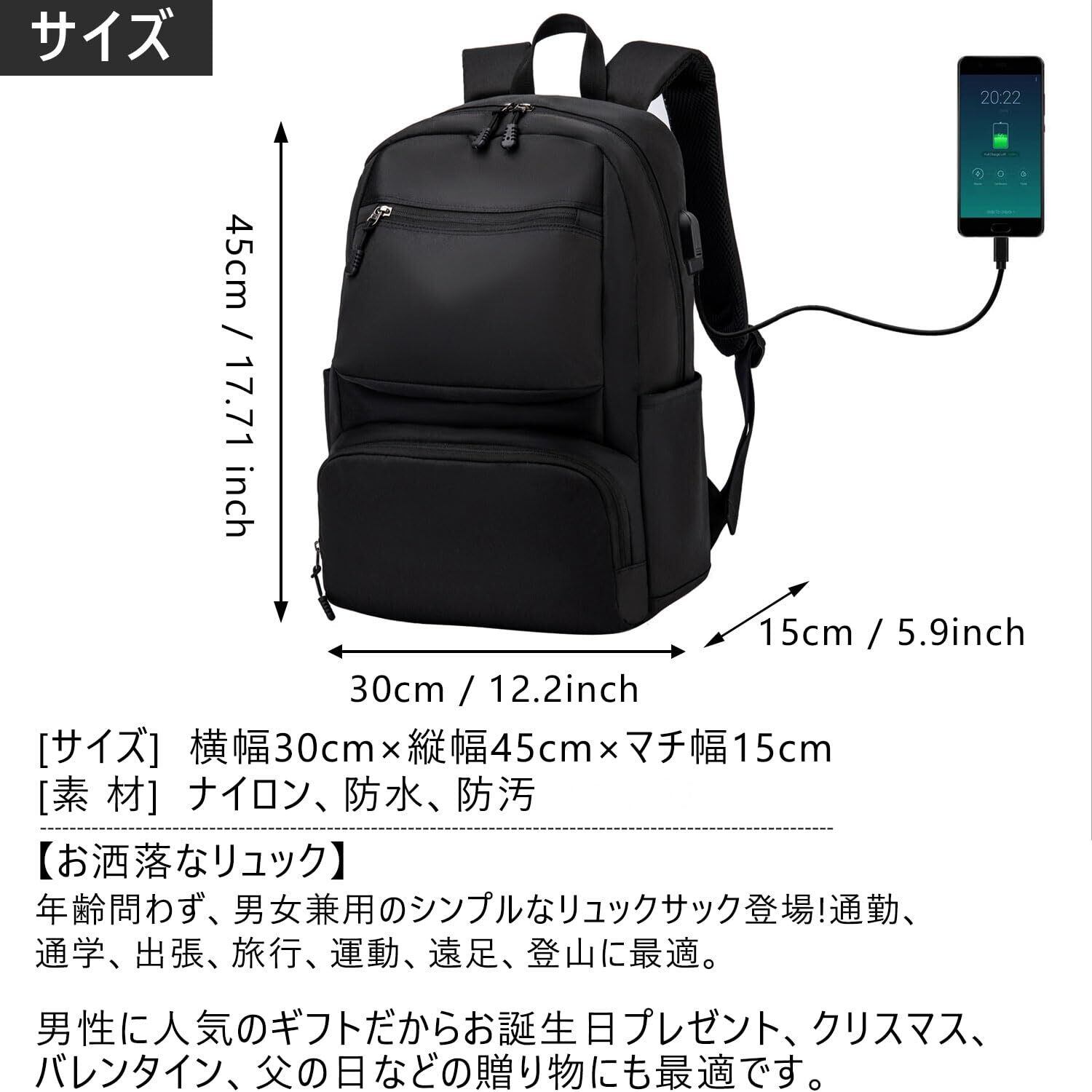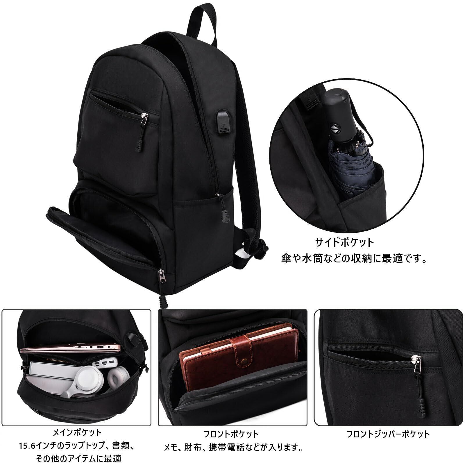 【軽量で大容量/USB充電ポート】収納力は十分にあり。A4サイズ、15.6"PC、教科書、傘、衣類、飲み物、お弁当、重い荷物を入れても安心感あり。通学や通勤や旅行や出張などにおすすめです。※バックパックの側面にUSB充電ポートあり、お手元のスマトホンを充電できます、気楽に片手で携帯電話が使えます。