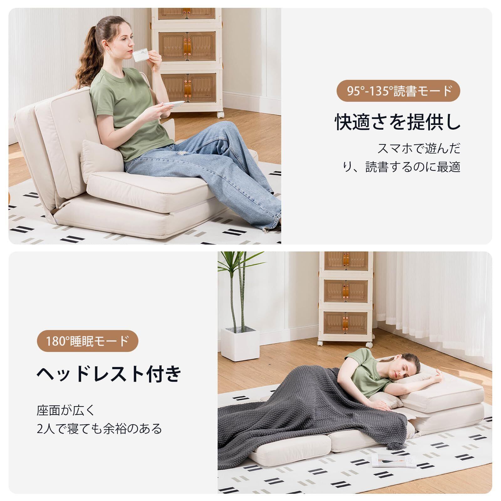 COMHOMA ソファベッド ソファーベッド レイジーソファー フロアソファー ローソファー 幅90 3WAY 6段階リクライニング 1人掛け 2人掛け クッション2個付き 耐摩耗 人間工学 ソファ 折り畳み 小型 疲れない B002-BEIGE