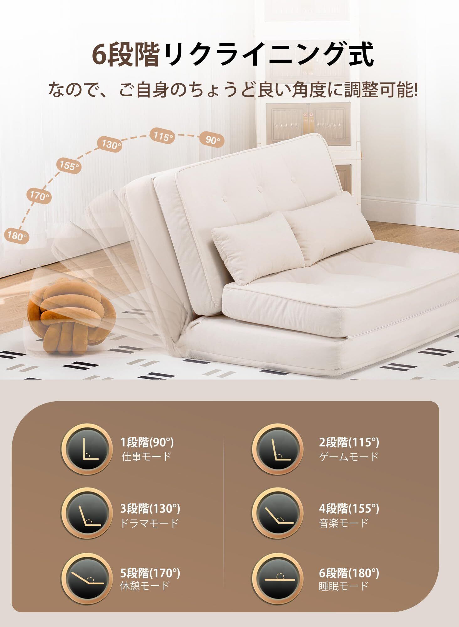 【多機能たたみソファ】この特別な6段階のソファベッドは、2つのヘッドレストが付いており、快適な睡眠とリラックスを提供します。さまざまな形に折りたたむことができるので、自分の快適な姿勢に合わせて調整できます。日常生活で優れた選択肢です。