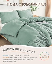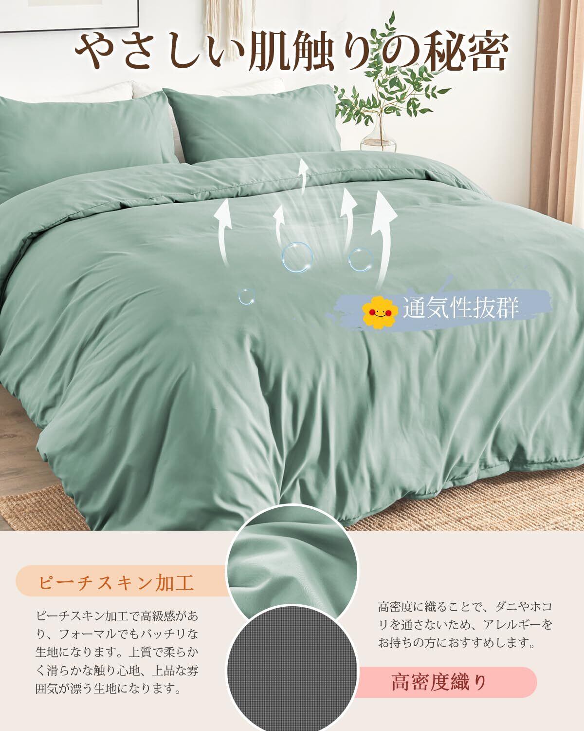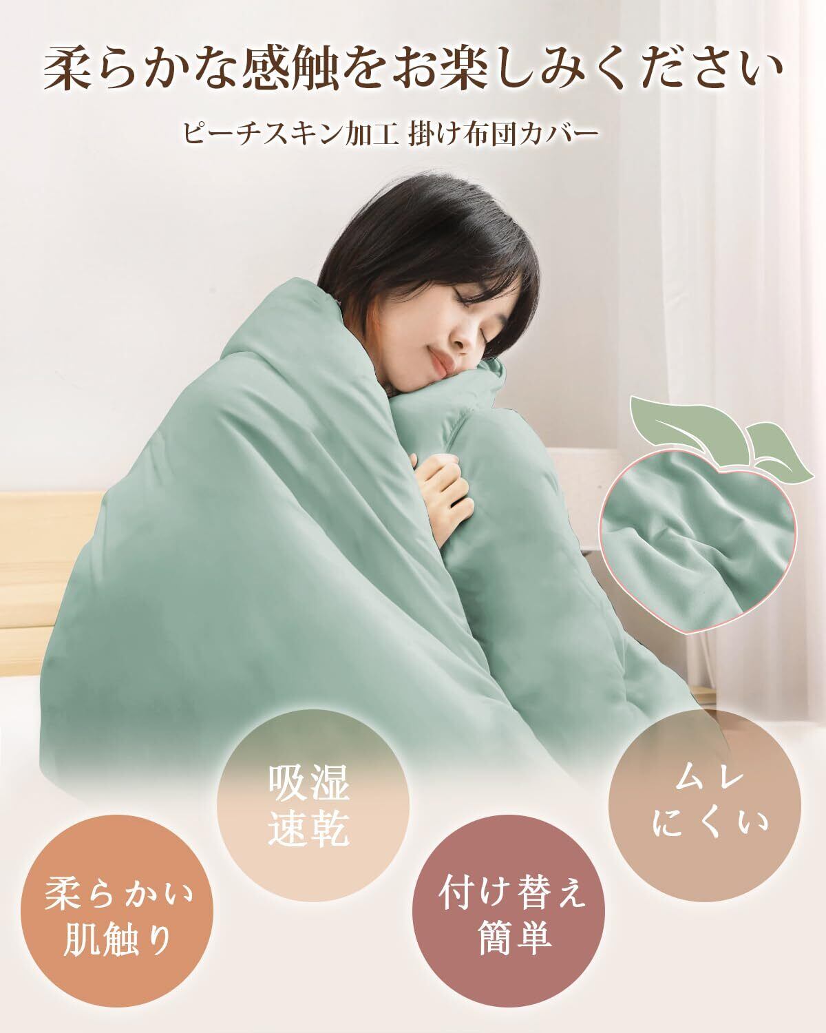 グリーンのピーチスキン加工による滑らかな肌触りが特徴で、見た目にも美しい印象を与えます。ダブルファスナー設計により、布団の出し入れが簡単に行え、お手入れもスムーズです。洗濯後はサラッとした質感が戻り、快適な使用感を提供します。