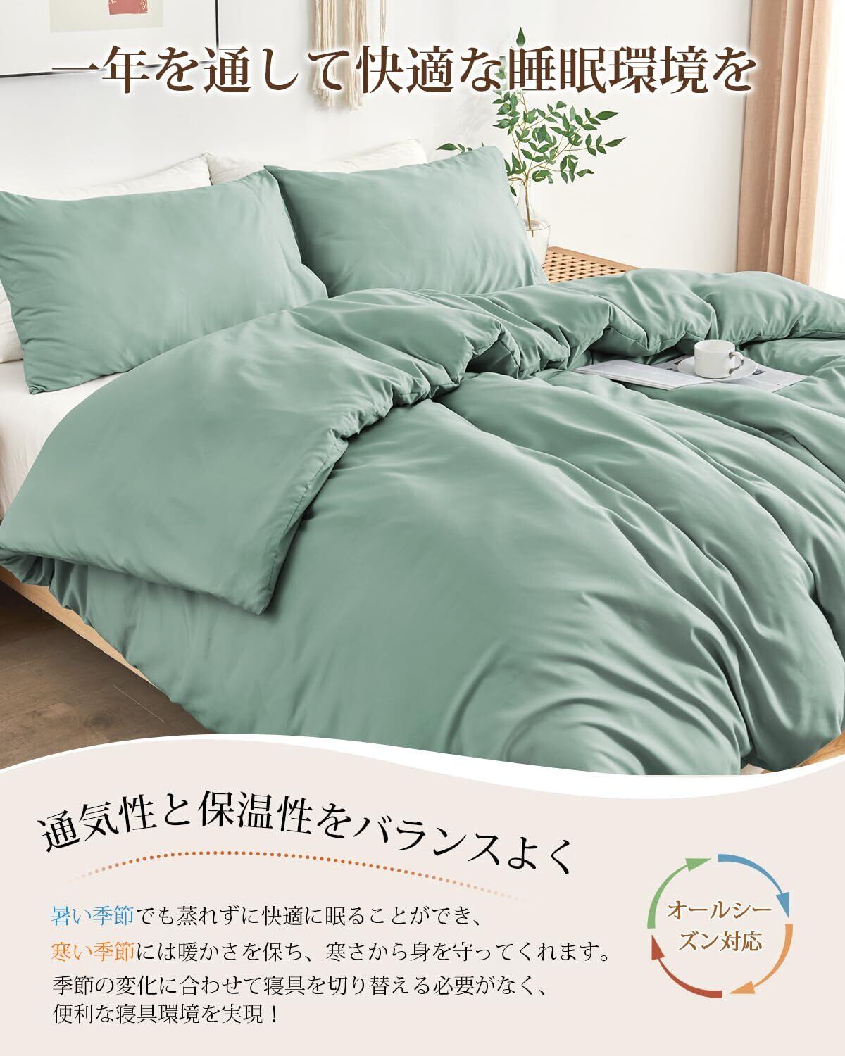 「この『HEVUMYI 掛け布団カバー』は、オールシーズン対応のシングルサイズで、快適な眠りをサポートします!約150×210cmのサイズは、様々な布団にフィットするとともに、高い吸水速乾性を備えています。」