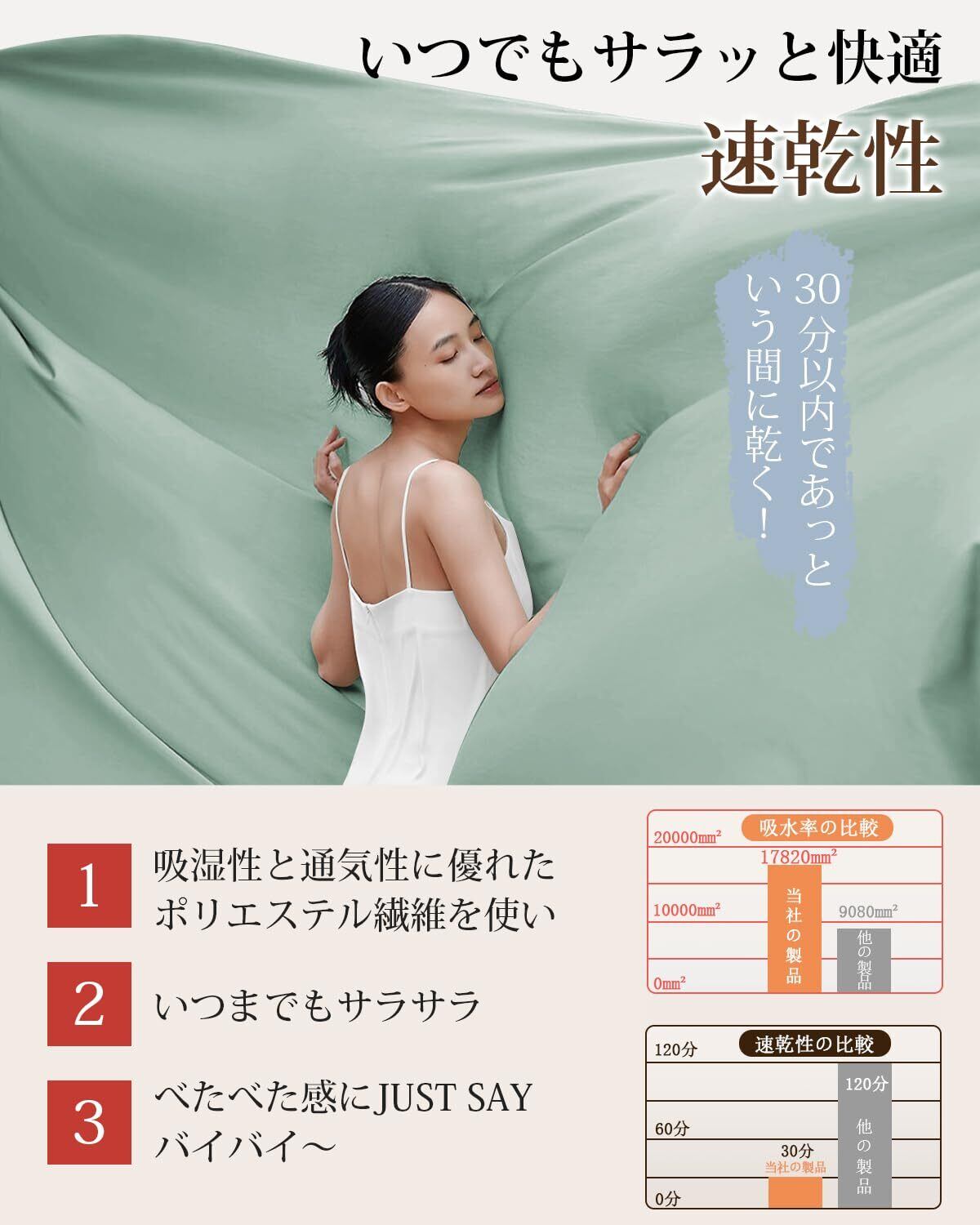 【0秒吸水&通気性抜群】吸湿性と通気性に優れたポリエステルは繊維の中に水分率がほとんど0に近いため,水や汗が生地に触れた瞬間にすぐさま拡散して蒸発します。汗ばんでも寝汗をしっかり吸収し、ベタつかず、サラッとした肌触りを保ちます。そのため、年間通し快適にお使いいただけます。