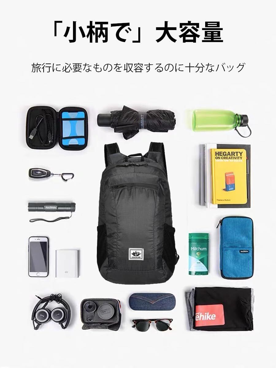 【軽量で折りたたみ可能】リュックサックの容量は20 L、重量は約85 g。収納袋を持参し、折りたたんで収納すると手のひらに近い大きさになり、そのままポケットに入れることができ、負担なく収納できます。
