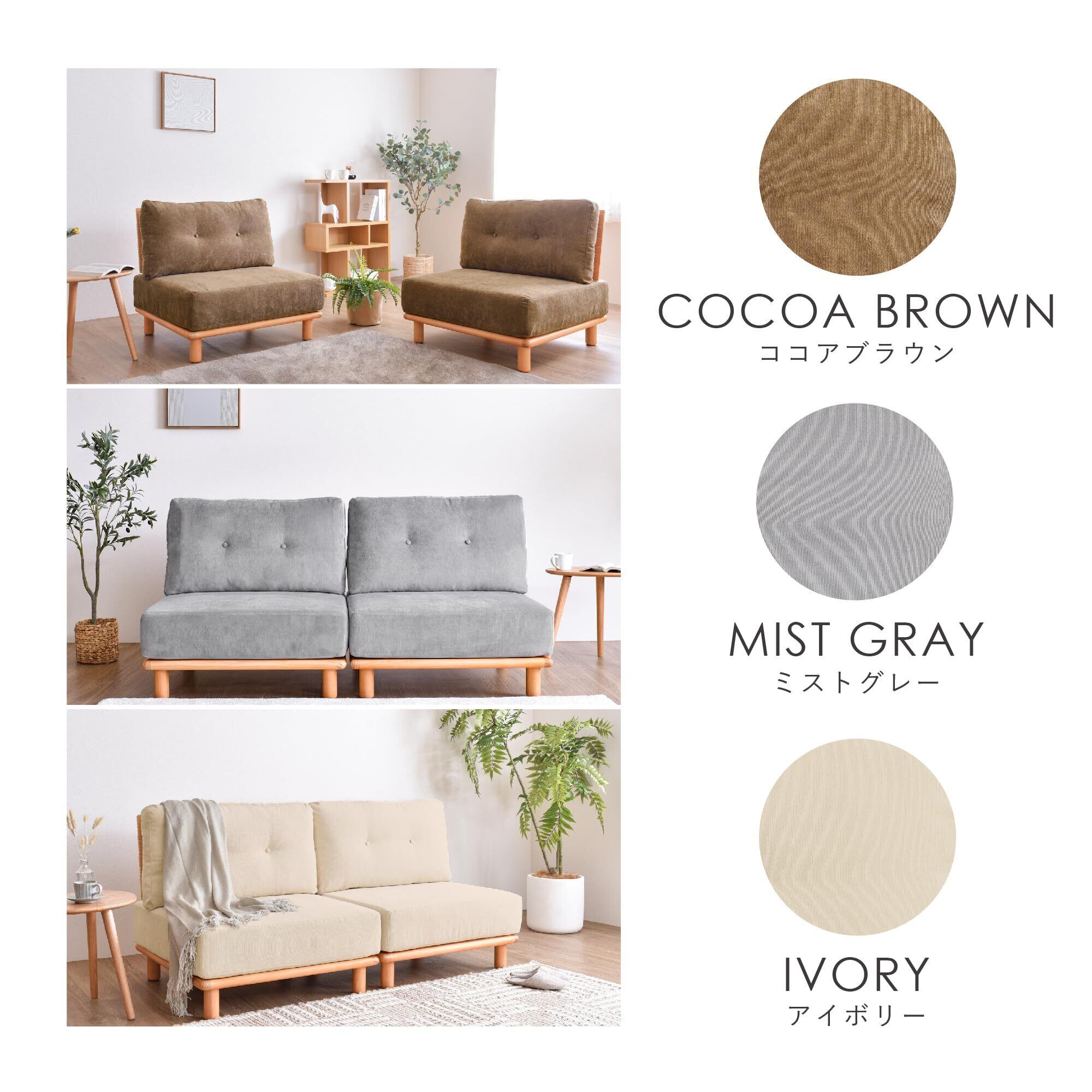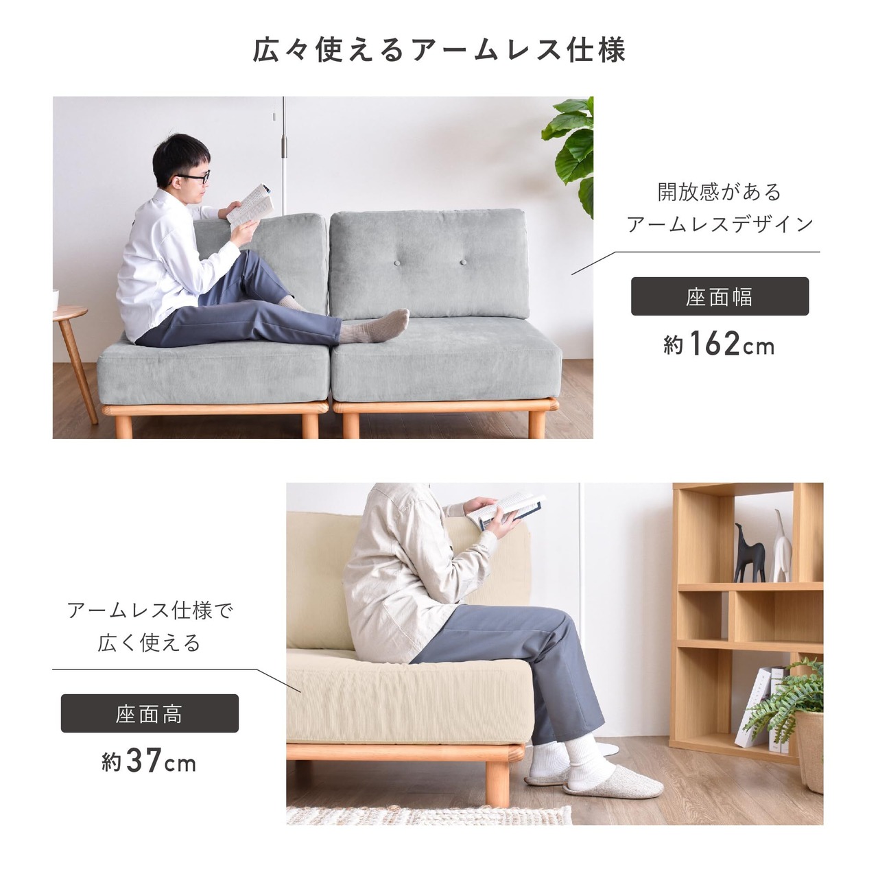 【広々使えるアームレス仕様】アームレスソファは、左右を気にすることなく寛ぐことができます。スッキリとした開放的なお部屋になり広く見えるのでお部屋を広くみせたい方におすすめです。【ゆったりと座れてくつろげる広々座面設計】足を伸ばして寛いだり、大人2人が並んでゆったり座れる座面幅です。あぐらをかいたり深く腰掛けたり、気分に合わせて自由にリラックスできます。どんな姿勢をも受け入れ、ストレスなく快適に過ごせます。【クッションカバーは洗濯が可能でお手入れ簡単】背面のクッションカバーと座面のカバーは取り外し可能です。ファスナーを開けて取り外しができるほか、取り外して洗濯ができるので万が一汚した際も簡単にお手入れができます。
