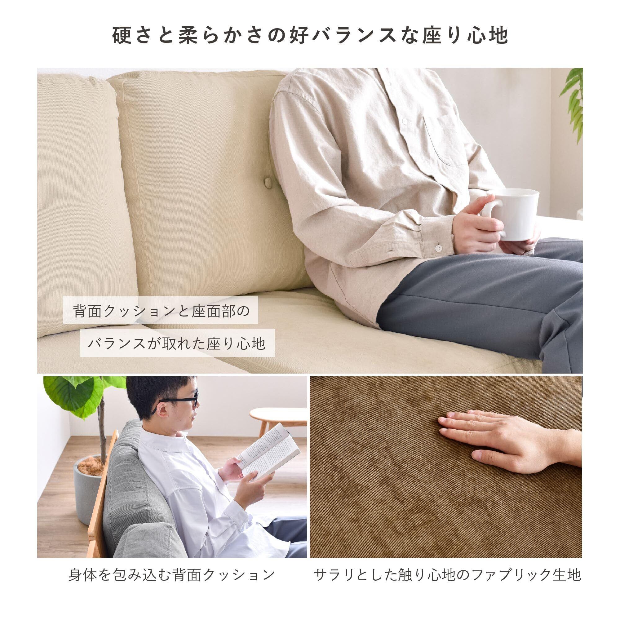 【硬さと柔らかさの好バランスな座り心地】ソファの座面部はポケットコイルを使用しており、座った際に程よい弾力があります。ポケットコイルは1つ1つが独立しており、座った部分の沈み込みが身体にフィットするほか、座った時の心地よさが長く続く耐久性があります。長時間使用の場合もヘタリにくく沈み過ぎがないので、長くご使用できます。背面クッションは身体をしっかりと包み込む柔らかさで背面と座面部でバランスが取れた座り心地のソファです。【座面部は程よい弾力があるポケットコイル仕様】複数のクッション材とポケットコイルが重なり弾力性が抜群の構造で立ち上がった後もすぐに元通り。ポケットコイルを使用したソファは、コイルが鋼のため長く使用してもへたらずに弾力性を保ちます。ポケットコイルが1つ1つ独立しているので、座った際にしっかりと身体にフィット。