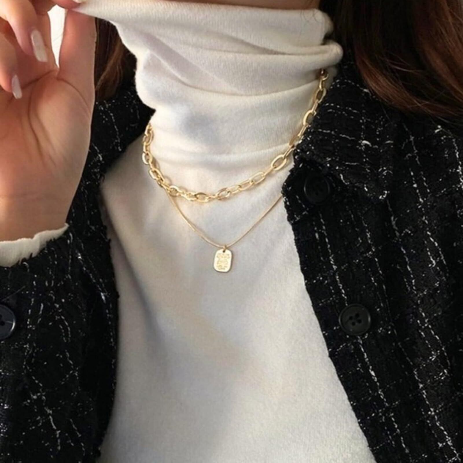 太めと細メ、デザインにメリハリのある2種類の ゴールドチエーンネックレスを重ねつけして、顔まわりにちょっぴり迫力ぷらす。
