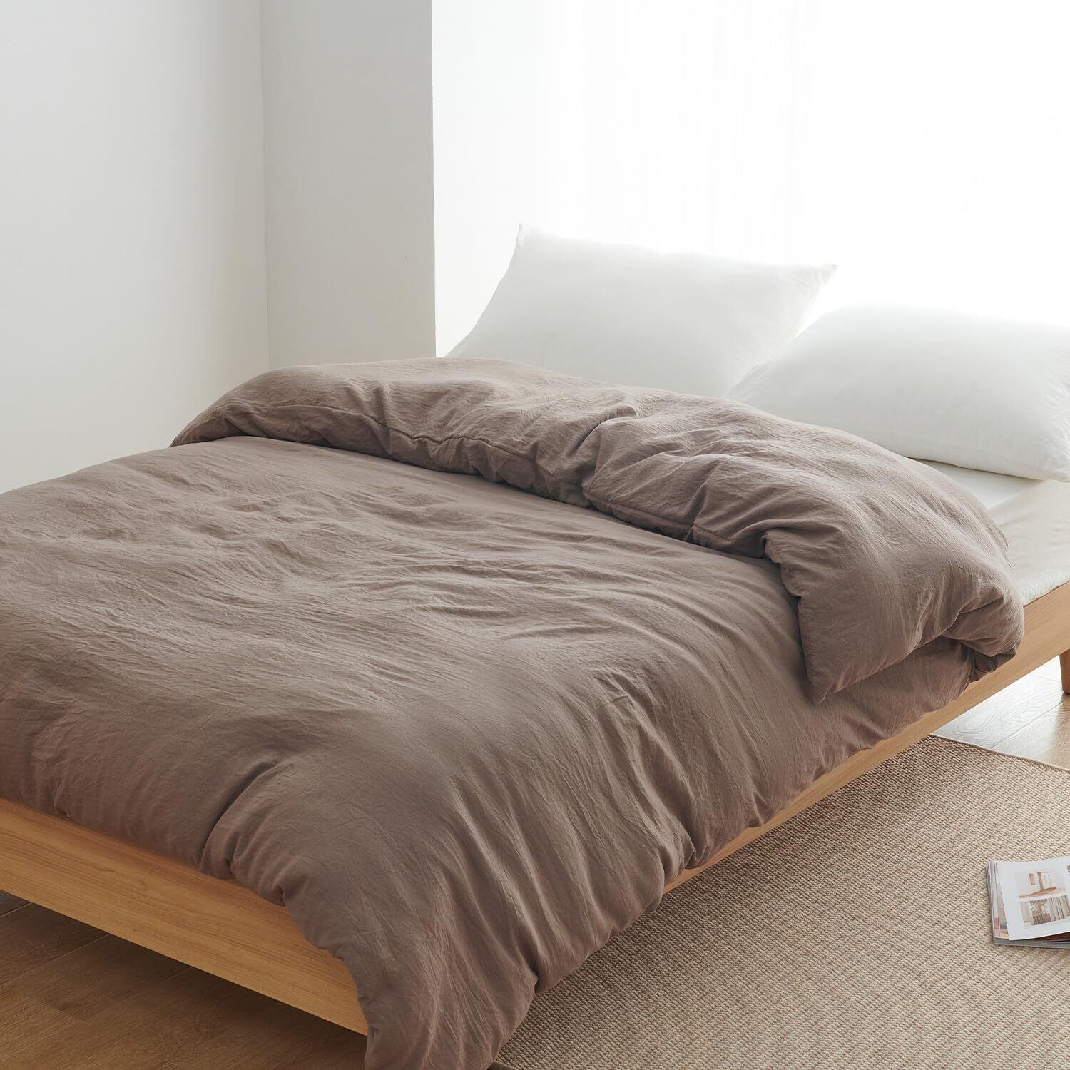 シワ加工が施されているため、アイロンがけの必要がなく、洗った後もそのまま自然な風合いを楽しむことができます。ナチュラルなグレージュカラーは、どんなインテリアにもマッチし、快適な寝室空間を演出します。