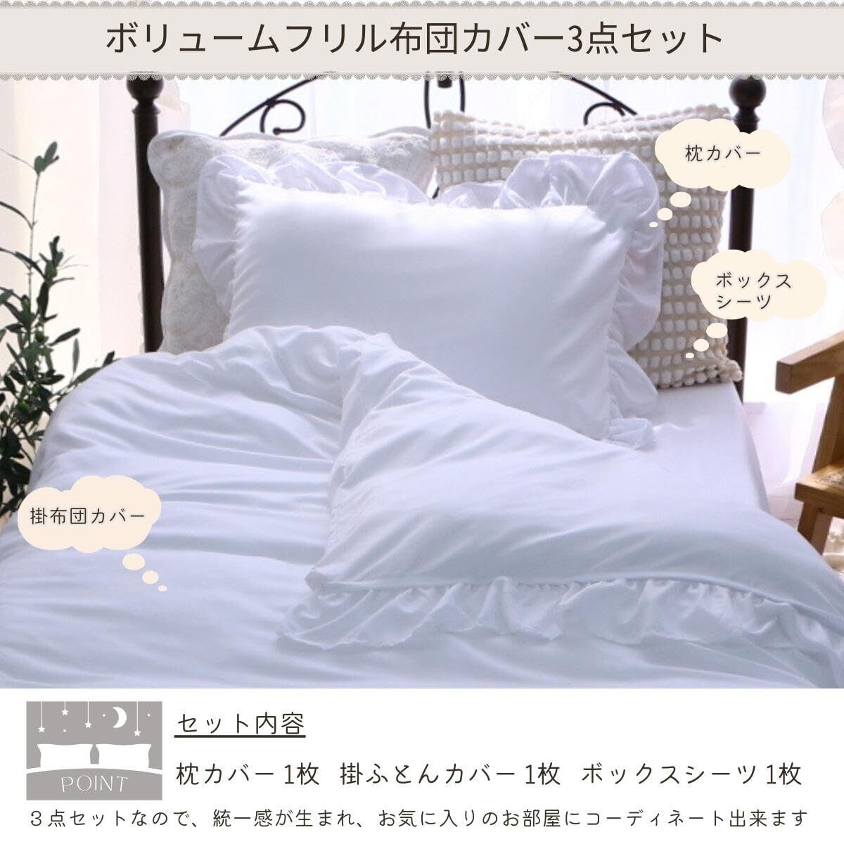 「この『シーフィールド フリル 布団カバー3点セット』は、あなたの寝室を可愛く彩るための必須アイテムです!心を癒すホイップミルクカラーとフリルデザインが特徴で、大人可愛いスタイルを演出します。」