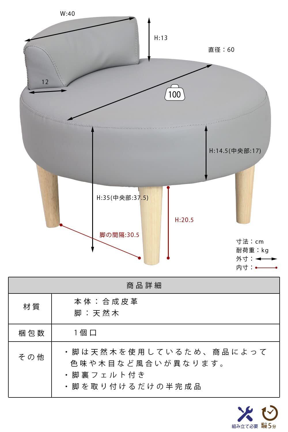 備考・脚裏フェルトあり・脚を取り付けるだけの簡単組み立て 生産国:中国 組立時間(目安)(大人2人)お客様組立(5分)