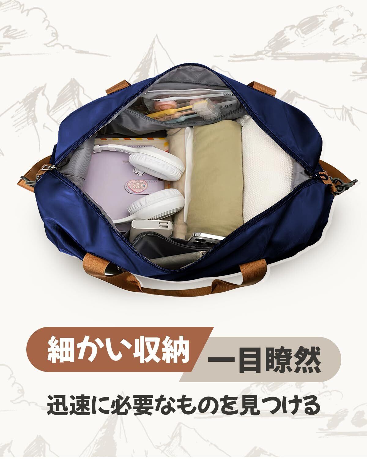 シューズ収納ポケットを備えており、靴を別々に収納できるため、他の荷物を汚す心配もありません。オーガナイザー機能も充実しており、小物を整理整頓しやすく、出し入れもスムーズです。旅行やアウトドア活動でも大活躍すること間違いなし!