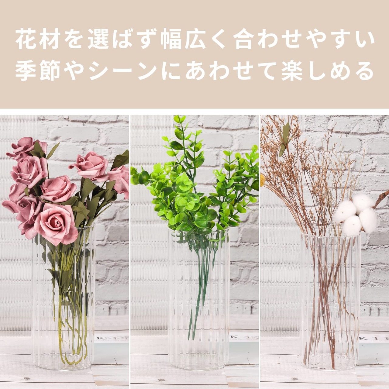 シーンを選ばず活躍する:シンプルで主張しすぎないため、玄関・リビング・ダイニングなどあらゆる空間に調和する透明花瓶です。季節のお花やグリーンを気軽に楽しめ、インテリアにさりげない華やかさを添えます