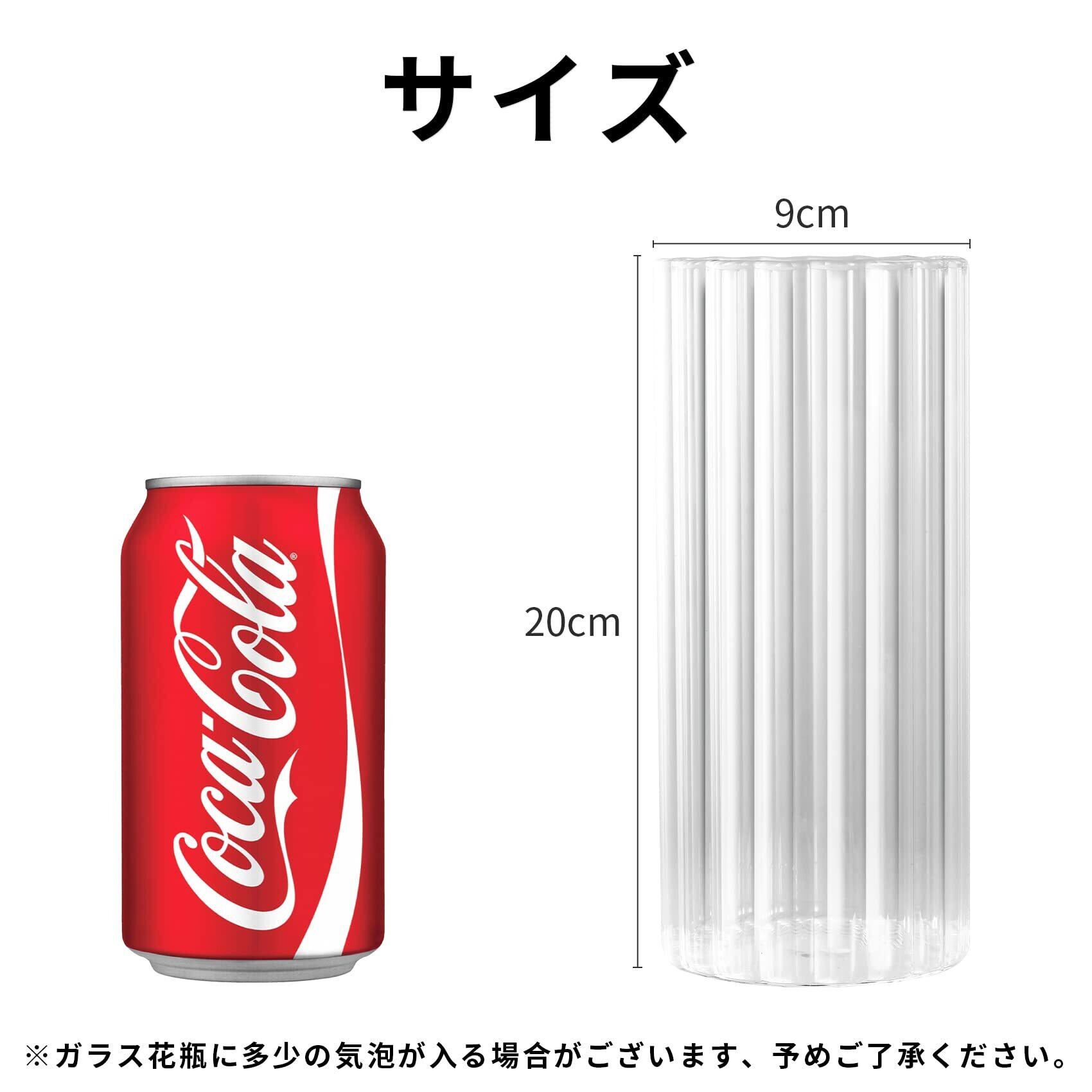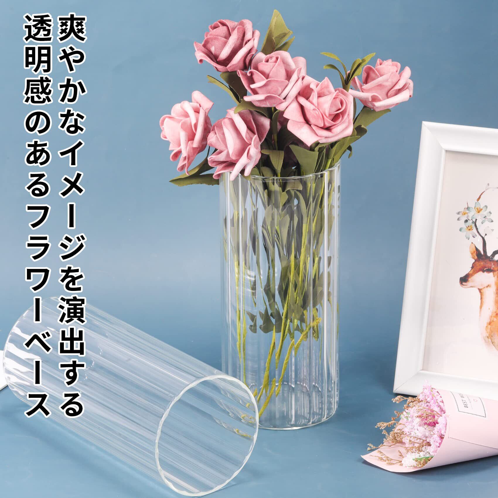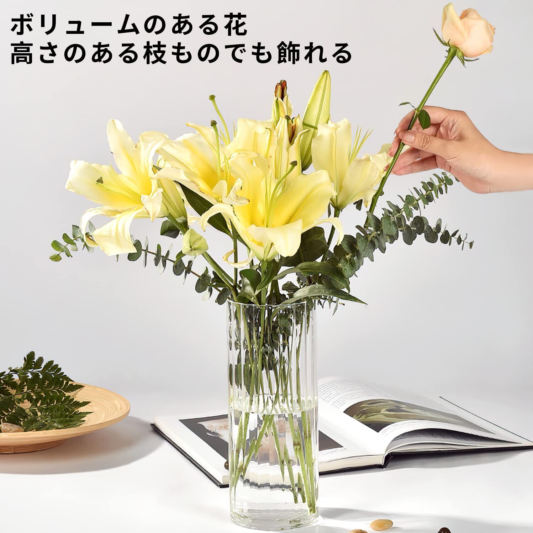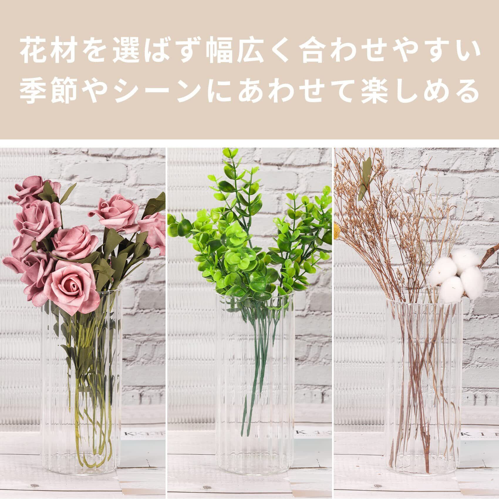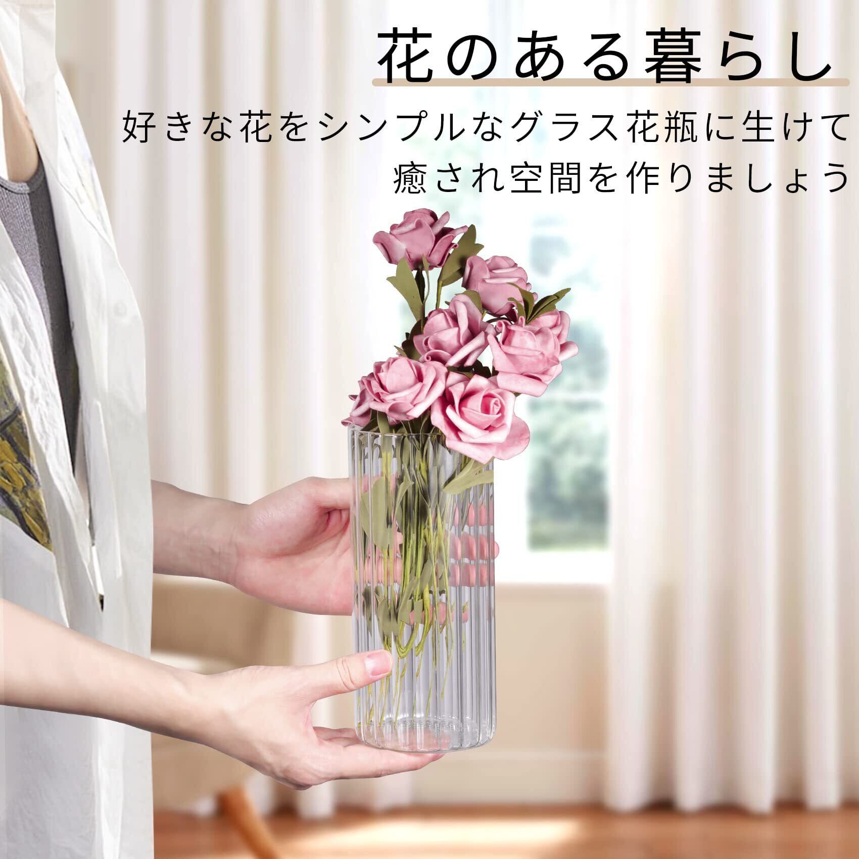 倒れにくい花瓶 :割れない花瓶の高さ約20cm・口径約9cmの円柱ガラス花瓶で、バラやユリ、カスミソウなど30〜45cmの花材にぴったり。50cm以上の枝ものや重たい花は、バランスを見て調整してください