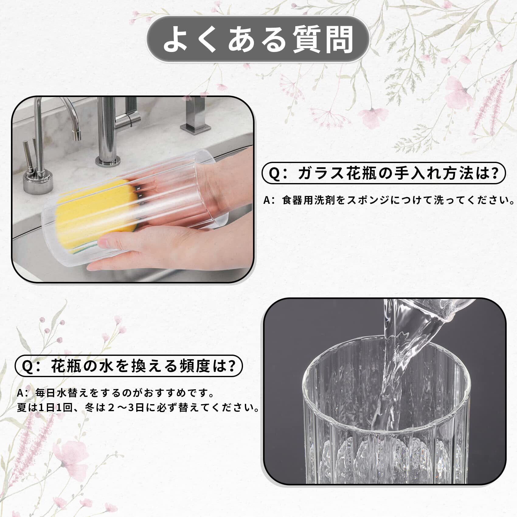 お手入れ簡単:ガラスフラワーベースは、口が大きく開くので、お手入れや水替えなどもラクラク、いつもキレイに保ちます。※お手入れの際は、やわらかいスポンジまたは手洗いをおすすめします