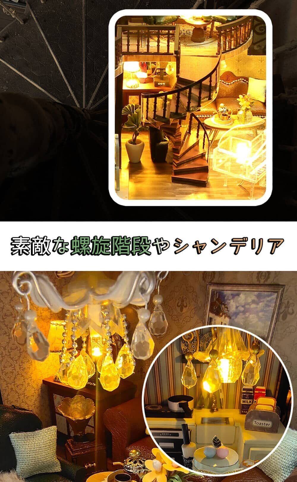 セットにはLEDライトが含まれており、完成したドールハウスをおしゃれに照らしてくれます。また、アクリルケースも付属しているため、大切な作品をほこりや傷から守りながら、インテリアとしても楽しめます。
