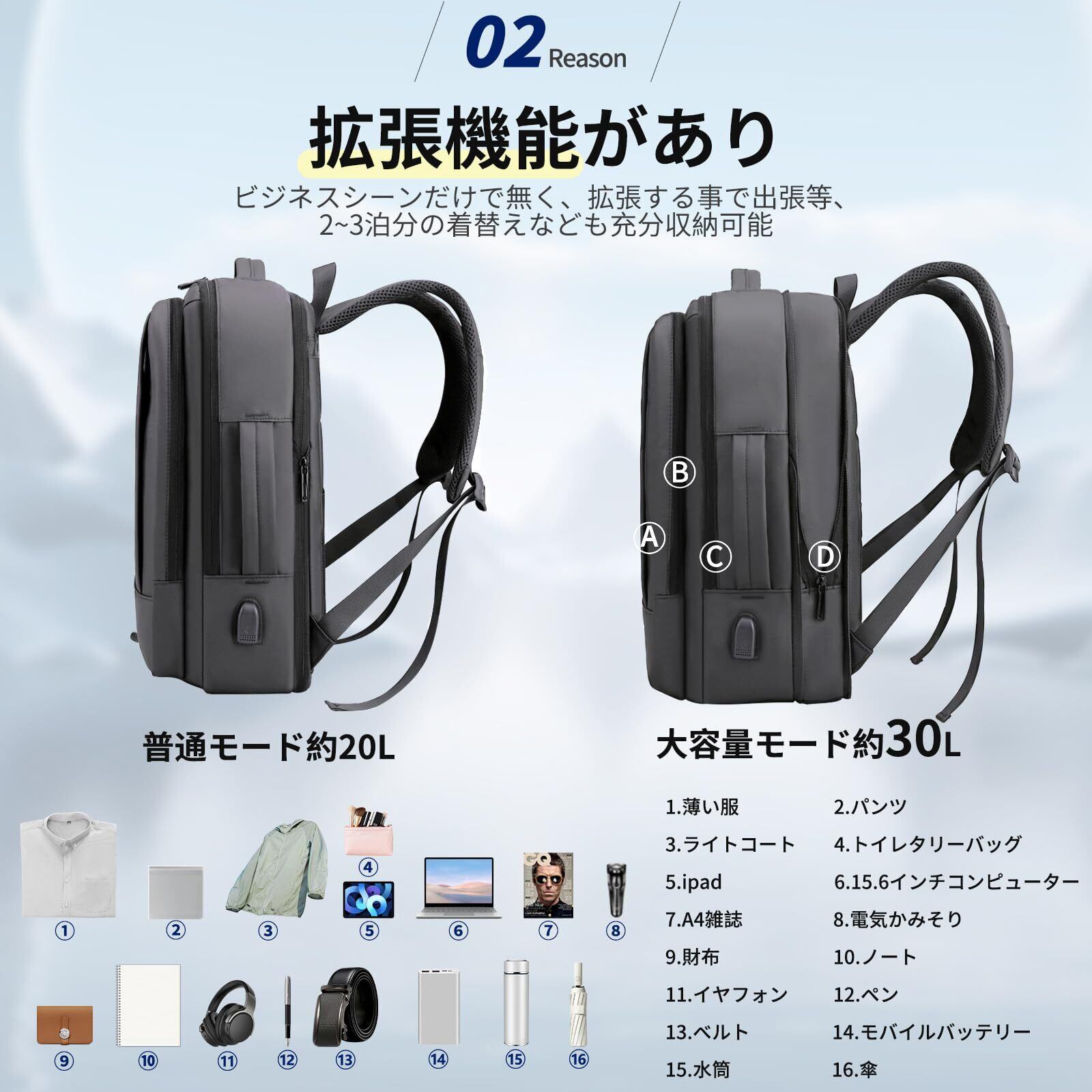 【マチ拡張&大容量収納】サイズ:45×34×12cm(拡張前:約20L)/45×34×20cm(拡張後:約30L)ポケットの数:11個(外側1/内側10)。リュックサックの1つの前置外ポケットは、いつでも取り出したい小物を簡単に収納できます。独立したパソコンポケットがあり、15.6インチのノートパソコンと 11インチのiPadを完全に収納できます。また、パソコンポケットのインナークッションは防震緩衝材とマジックシールの閉鎖方式を採用し、重要なパソコンとタブレットを保護することができます。マチ拡張前、リュックの厚みはわずか12cmなので取り回しやすく、日常の通勤にぴったりでした。拡張後、合計約30Lの貯蔵スペースと分倉設計は、1泊2日の出張に必要なすべてのものを収容できます。通勤、出張、通学、旅行など様々な場合に合わせて利用できます。