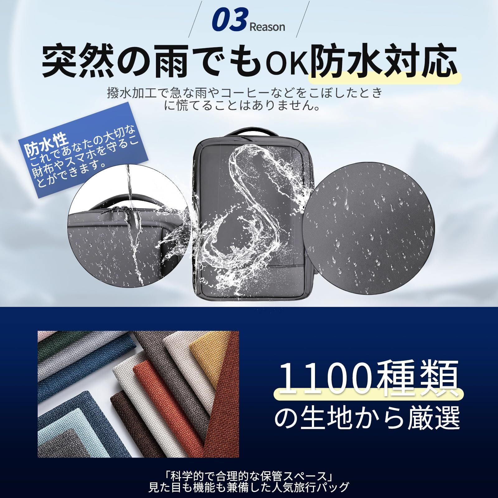 高品質な防水生地を使用しているため、急な雨でも中の荷物をしっかり守ります。大切なPCや書類を安全に保管できるので、天候に左右されずに安心してお出かけできます。