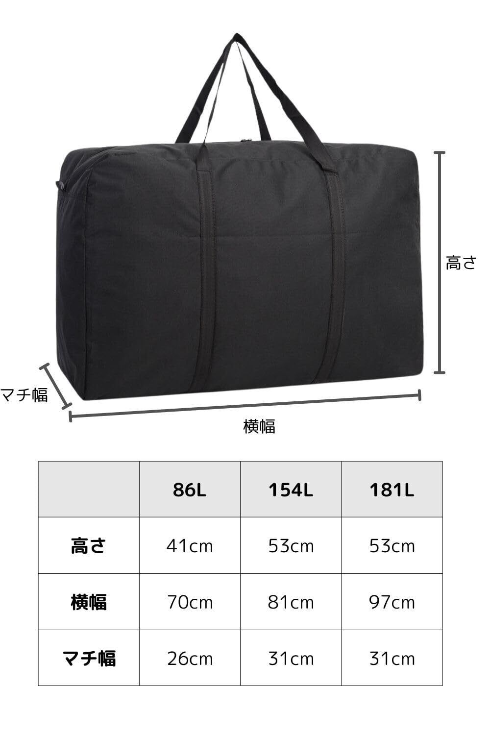 ボストンバッグ 【選べる容量86L-181L】 大容量 大型バッグ 大きいバッグ 旅行カバン (ブラック, 86L)