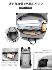 【多機能設計】前測定ポケット設計、常用小物を置くことができる。両側の網袋には傘やコップを入れることができるように設計されている。リュックの内部にはフックが付いていて、リュックを広げた後に収納袋をリュックの中に直接かけることができて、美しくて便利です。