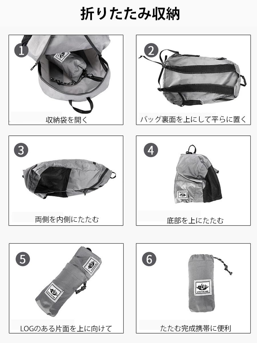 【軽量で折りたたみ可能】リュックサックの容量は20 L、重量は約85 g。収納袋を持参し、折りたたんで収納すると手のひらに近い大きさになり、そのままポケットに入れることができ、負担なく収納できます。