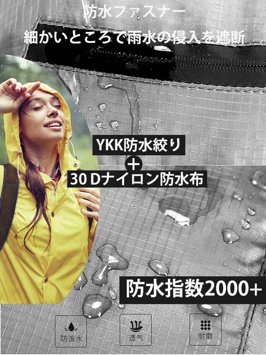 【耐摩耗性と防水性】このリュックサックは30 Dナイロン布の材料で作られており、丈夫で耐久性がある。リュック生地部分の防水のほか、ファスナー部分にもYKK防水ファスナーを採用しており、雨水でもファスナーの隙間から浸透しないようになっている。リュックサックの全体防水指数は2000+。