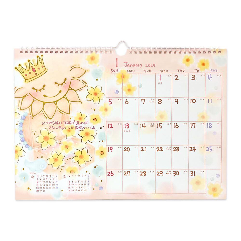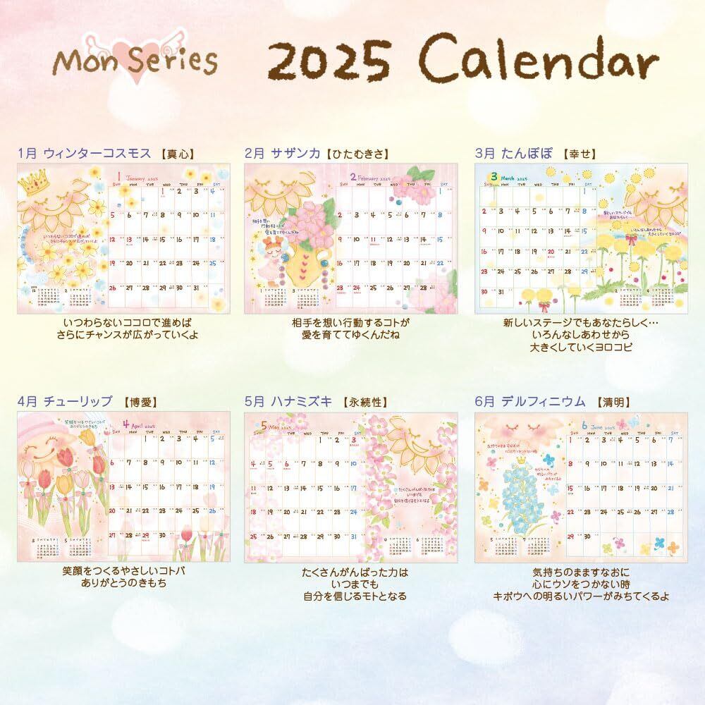 【その他】イラストとメッセージがいつもあなたをあたたかい気持ちにさせてくれる「もんシリーズ」。書き込みスペースも大きいので実用性も兼ね備えています。12枚綴り、リング仕様、六曜月相表記、日曜始まり、絵柄に金箔加工を施しています。