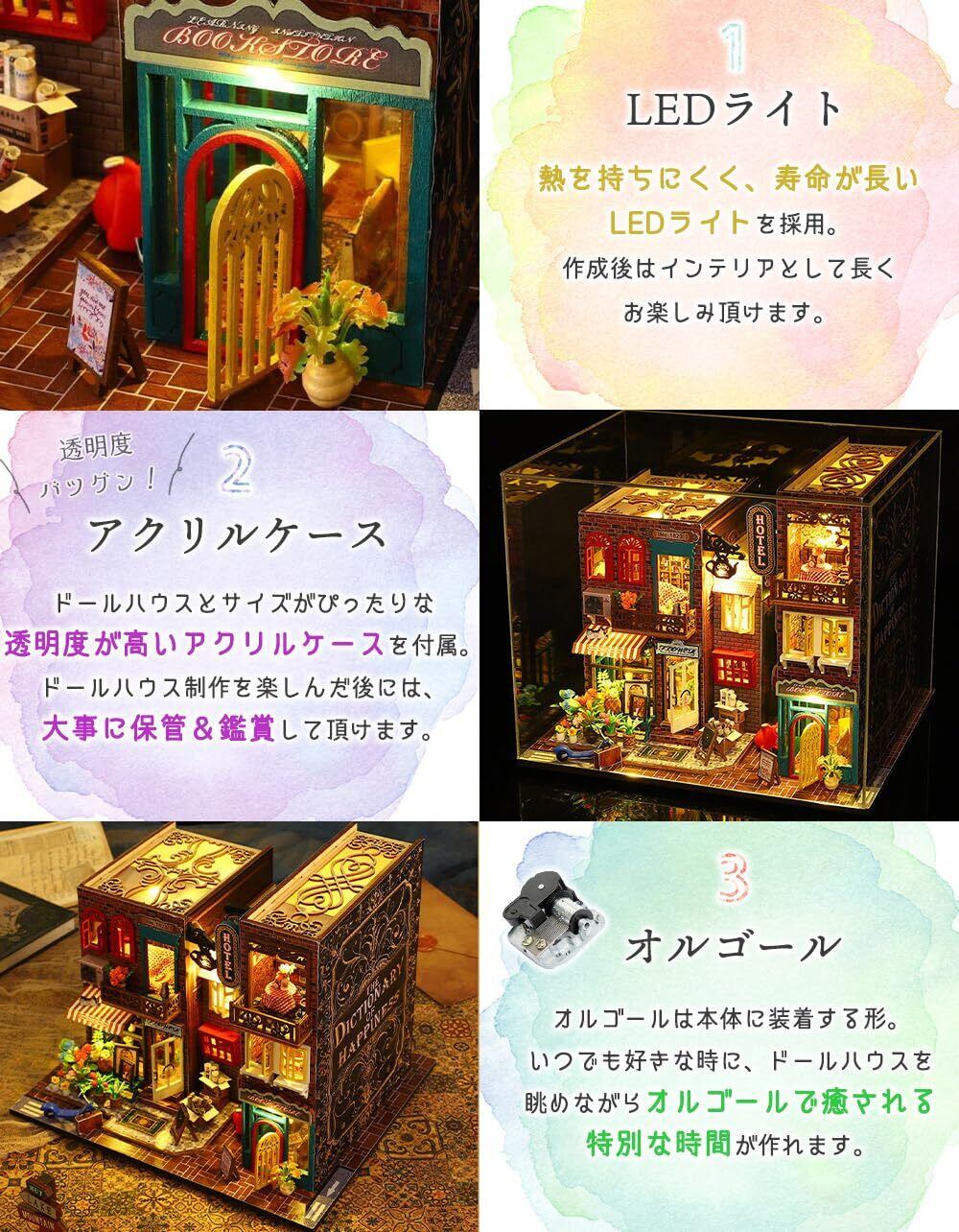 LEDライトが付属しており、完成後は素敵な照明で小さな世界を照らします。また、オルゴールもセットになっているため、癒しのメロディーを楽しみながら、その美しい景色を眺めることができます。アクリルケースも含まれているので、完成品をおしゃれに飾ることが可能です。