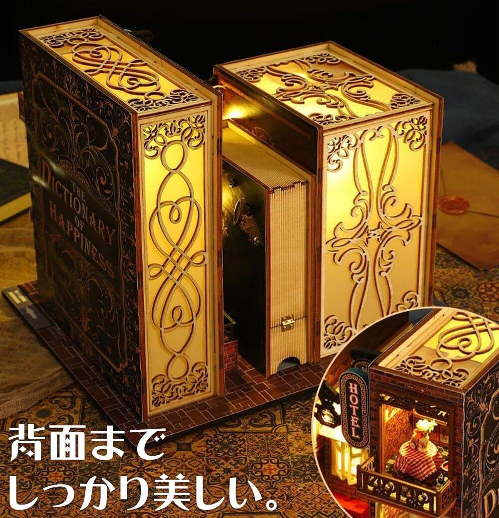 moin moin ドールハウス ミニチュア 手作りキット セット 本棚 の中の小さな世界 本 ブック エンド スタンド 本棚 インテリア カフェ バイク 観光地 | LEDライト + アクリルケース + オルゴール 付属 2310dh401