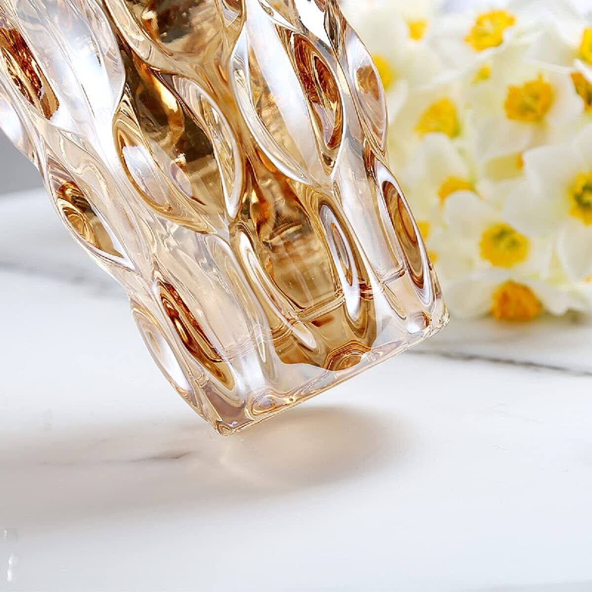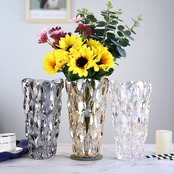 「この『ガラス フラワーベース』は、モダンなデザインが魅力の素晴らしいインテリアアイテムです!透明なガラスとグラデーション効果により、花の美しさを引き立て、お部屋を一層華やかに演出します。」