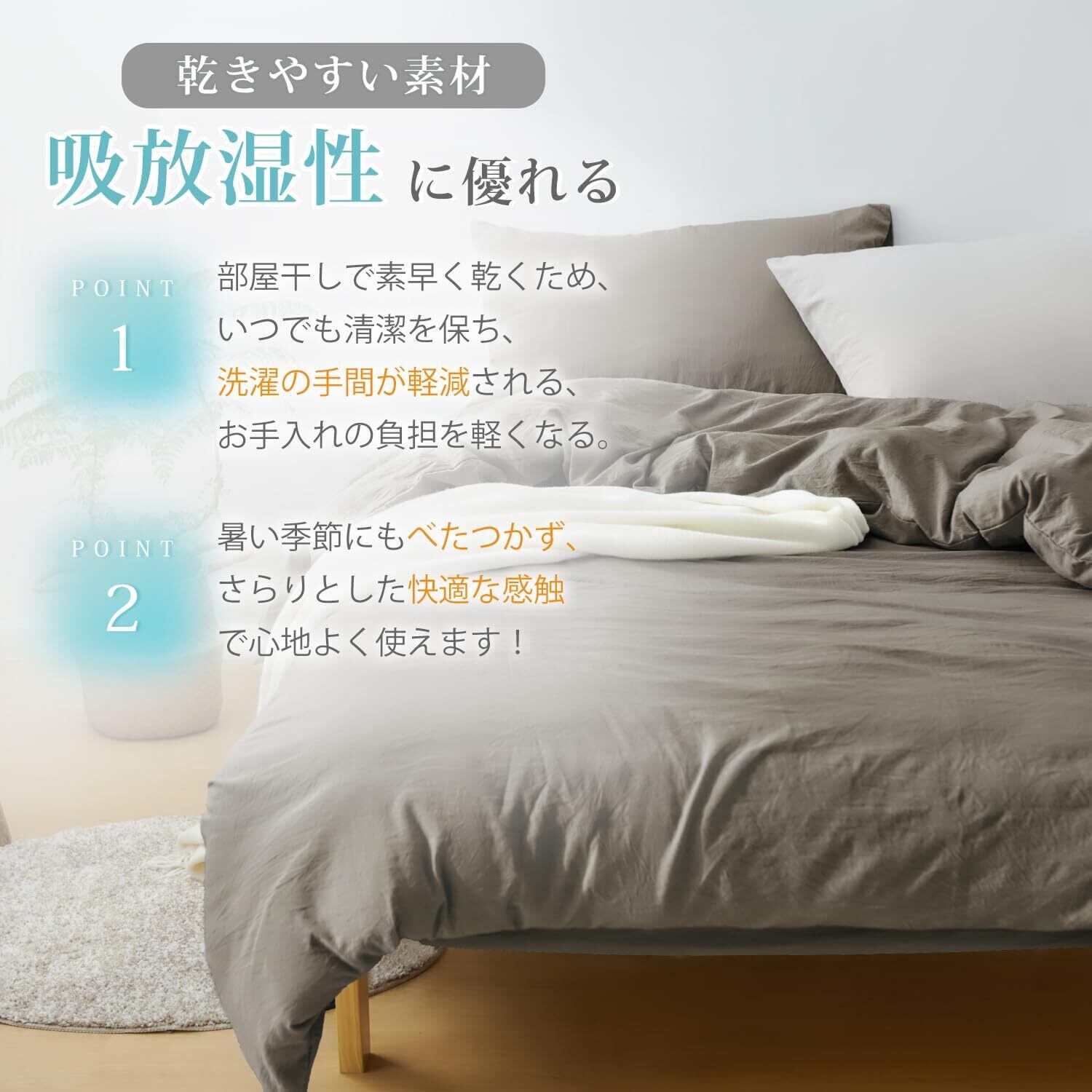 ■特徴:洗える、肌に優しい、吸水速乾、シワ加工、無地