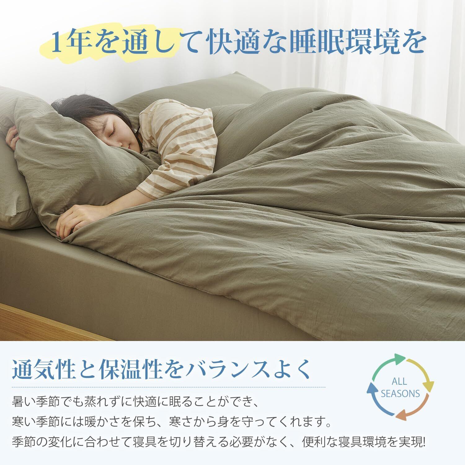 この掛け布団カバーは、オールシーズン使用可能で、季節を問わず快適にお眠りいただけます。また、シワ加工が施されており、洗濯後も手間要らず!丸洗いもできるので、簡単に清潔を保てます。