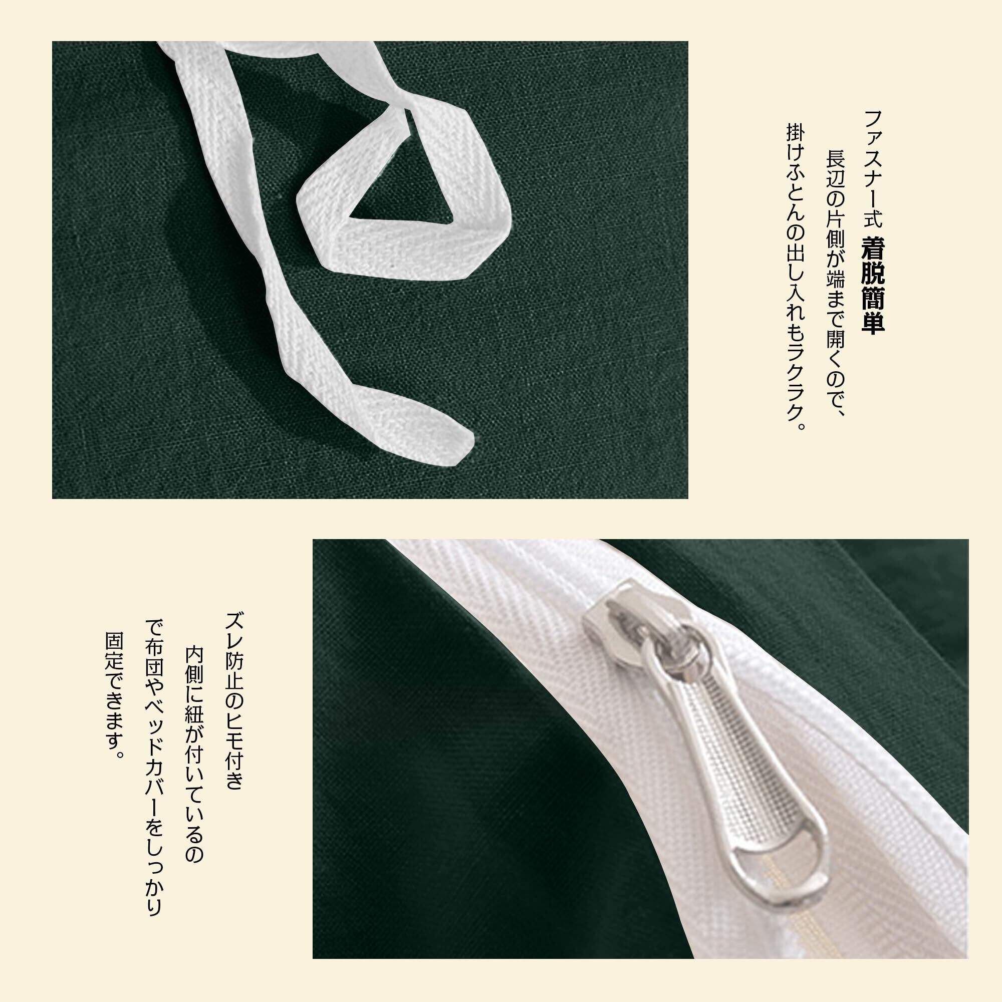 【全開ファスナー 取り付けラクラク】この布団カバーは使いやすさを追求した設計で、カバーの片側には全開ファスナーがあり、8ヶ所の紐で布団を固定できます。ぐーんと大きく開くので大変なふとんの出し入れがスムーズにできます。お手入れも簡単なので、忙しい主婦の強い味方です。一人暮らしの方や衣類のお手入れが難しい方におすすめです。