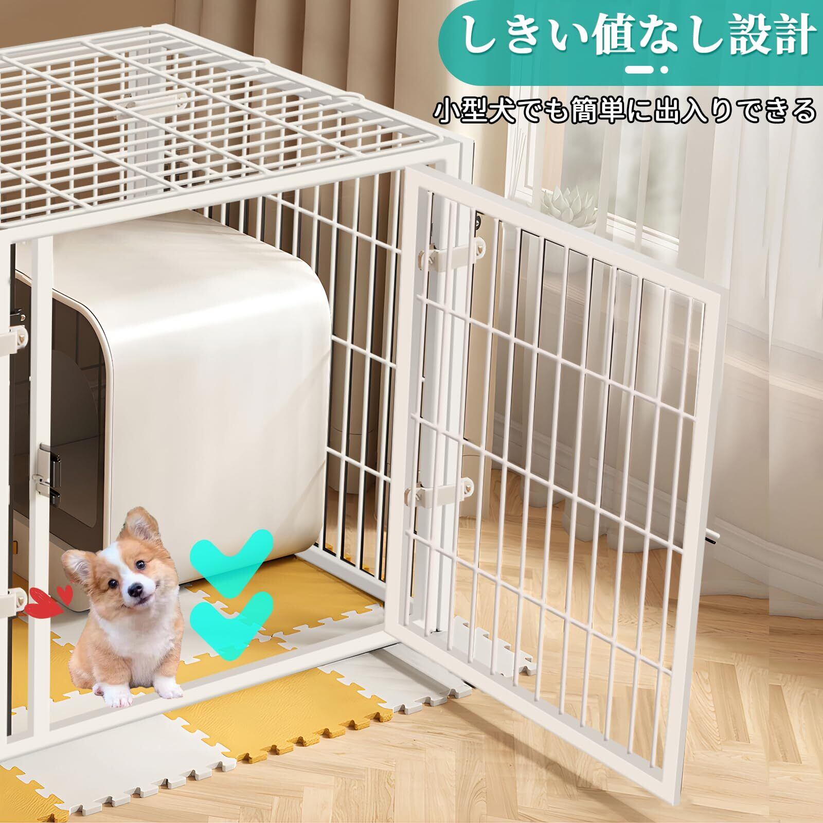 【広いスペース・屋根面付き】犬が自由に動き回れる広い室内空間。広々としたリビングスペースは、ペットの行動エリアを区別し、ペットが自由に動けるようにするために使用できる。屋根面付き、犬・猫兼用、ペットの脱獄や脱走を防ぐ。