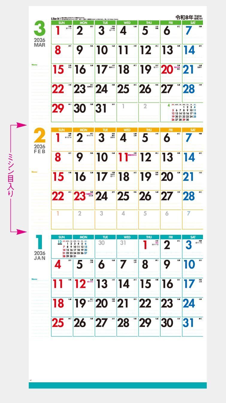 壁掛けカレンダー 2026年版 Like it Color 3ヶ月カレンダー 毎月切り取り ミシン目 メモスペース IC-302