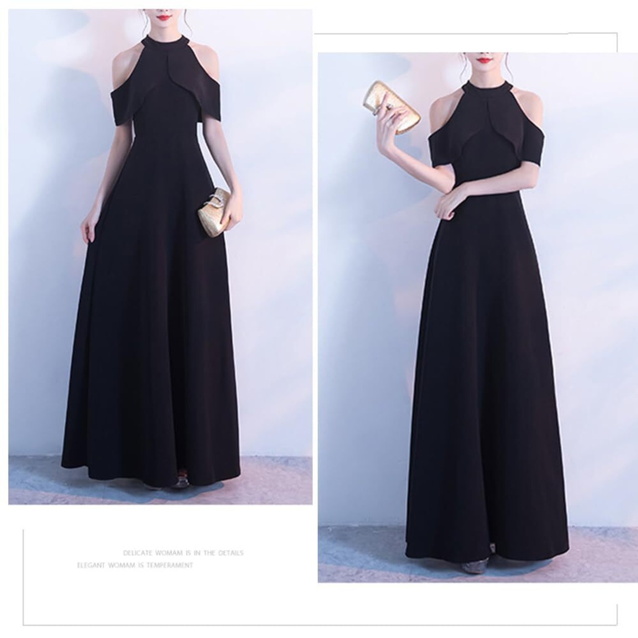■特徴:Aライン・ハイウエスト・フレアスカート・ホルターネック・上品デザイン