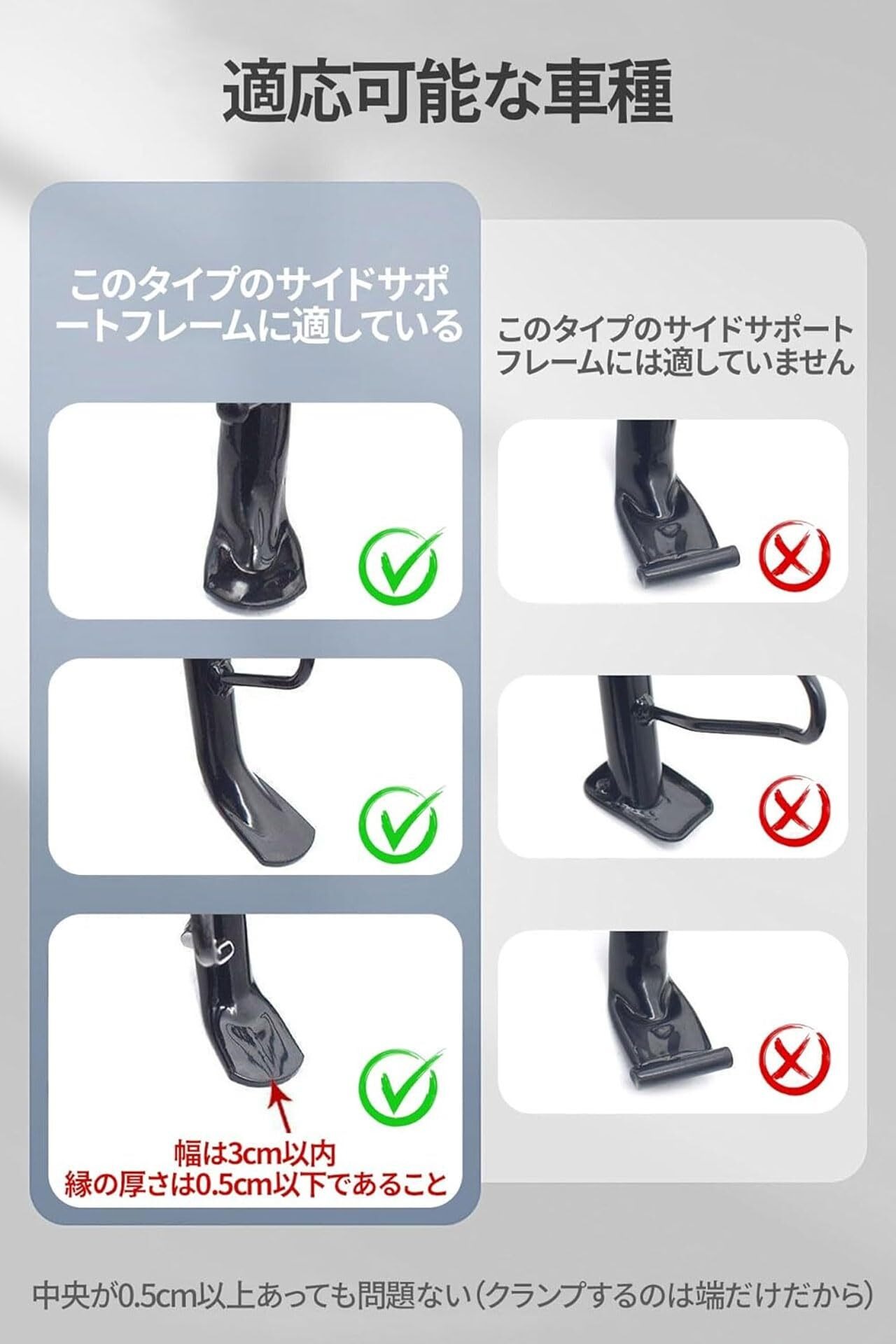 本製品は汎用タイプで、ほとんどのバイクに適合します。サイドスタンドの延長ブラケットとしても機能し、低めのバイクや重いバイクでも確実に支えることができます。バイク愛好者やカスタマイズを楽しむ方には非常に便利なアイテムです。