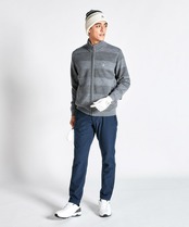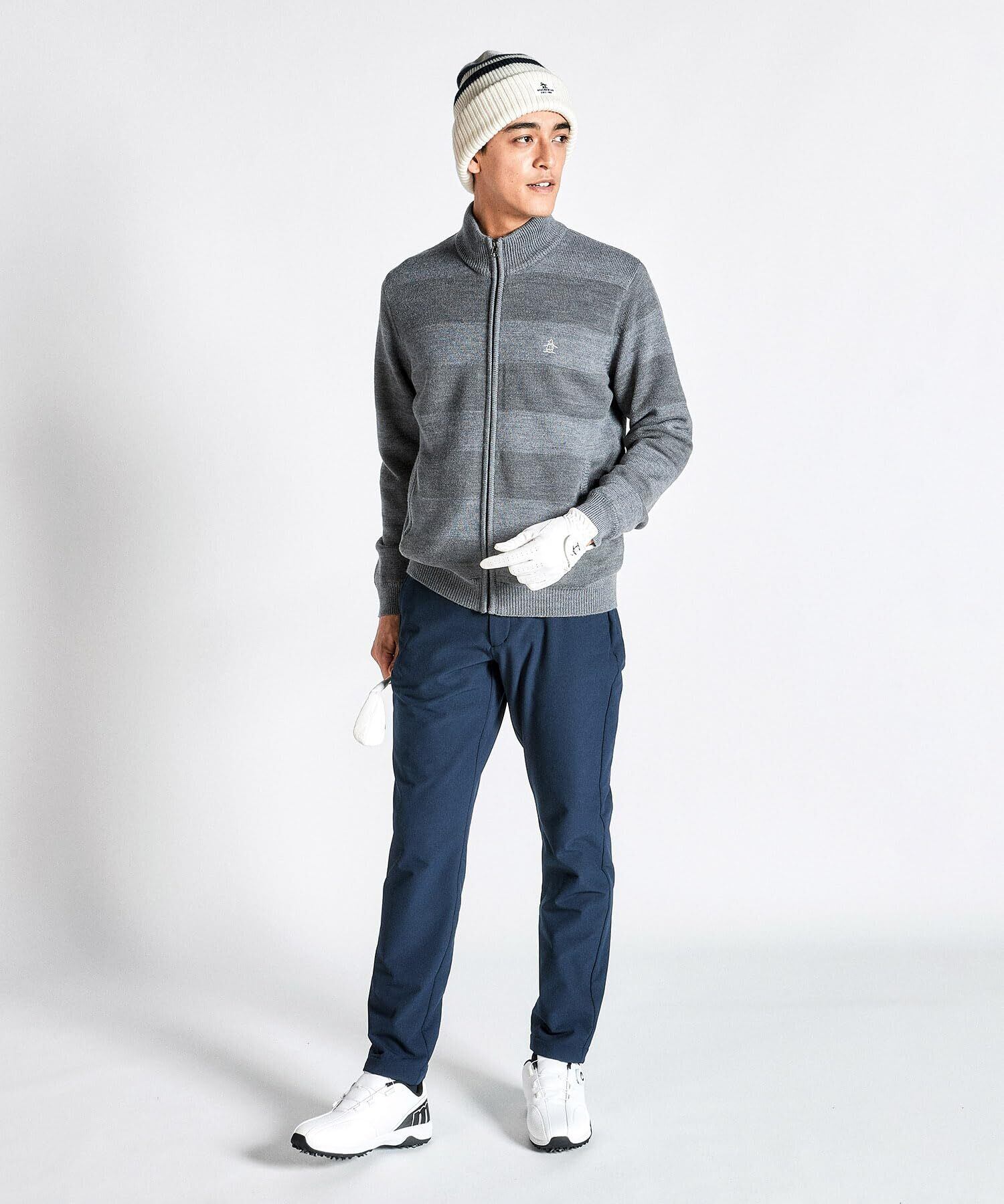 このニットブルゾンは、防風性能を備えた高品質な素材を使用しており、風の強い日でも安心してプレーできます。また、裏地があることで暖かさをキープしつつ、プレー中の動きやすさも重視して設計されています。おしゃれなボーダー柄がコーディネートのアクセントになり、ゴルフ場での存在感を引き立てます。
