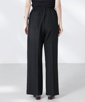 軽やかな素材を使用しており、リラックスしたフィット感が特徴です。ウエスト部分はゴム仕様で、着脱も簡単。日常使いからオフィスシーンまで幅広く活躍してくれるパンツです。ストレートラインが美脚効果も期待できます。