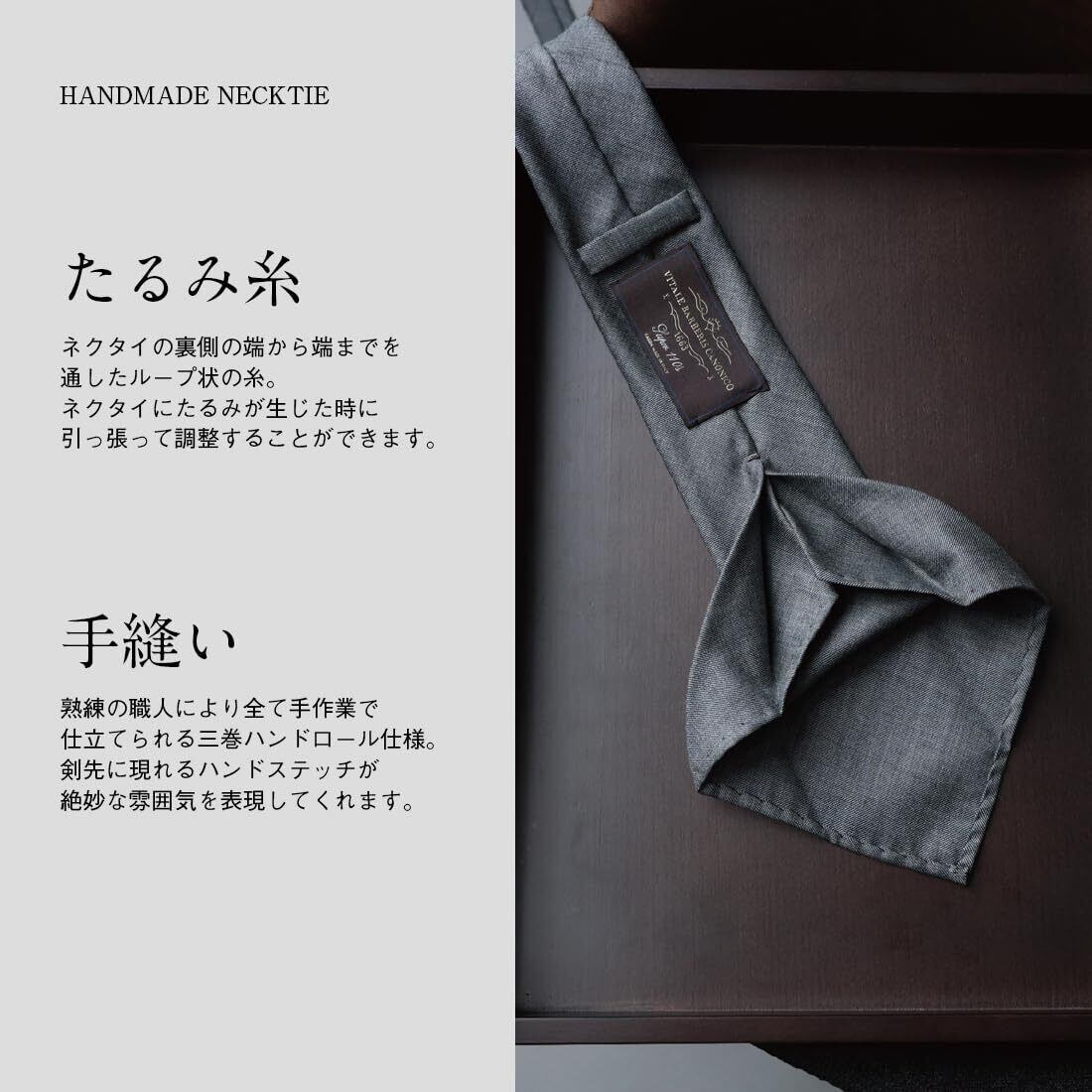 セッテピエゲ(七つ折り)構造を採用しており、ボリューム感とドレープ性が際立つ仕上がりです。三巻ハンドロールで丁寧に仕上げられたこのネクタイは、ビジネスはもちろん、フォーマルな場面でも魅力を発揮します。日本製ならではの高い技術が裏付ける確かなクオリティをお楽しみください。