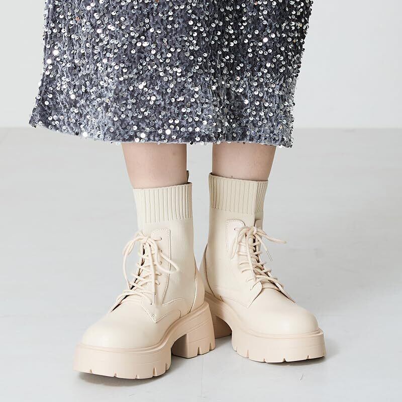 このファッションブーツは、驚くほど軽量な構造で、長時間の着用でも快適に過ごせます。柔らかなニット素材が足をしっかり包み込み、ぴったりとフィットしながらもストレスを感じさせません。まるで靴下のような感覚で、毎日のコーディネートに取り入れやすい一足です。