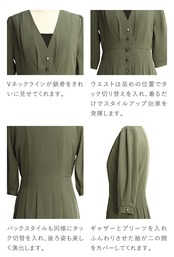 フロントボタンのスタイルは、ジャケットやカーディガンとの相性が抜群で、オフィススタイルからカジュアルなお出かけまで幅広く対応します。また、ウエストタックのデザインがシルエットを美しく演出し、大人の女性にぴったりの一着です。