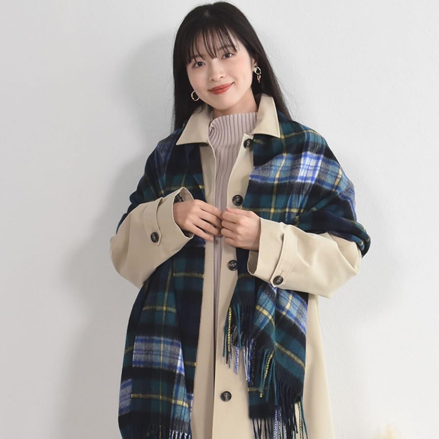 この大判ストールは、スタイリッシュなチェック柄が特徴で、どんなシーンにもマッチします。大きめのサイズ感で、肩にかけたり、首に巻いたりと、多彩なアレンジが楽しめます。シーズンを問わずお使いいただけるデザインで、コーディネートのアクセントとして活躍します。