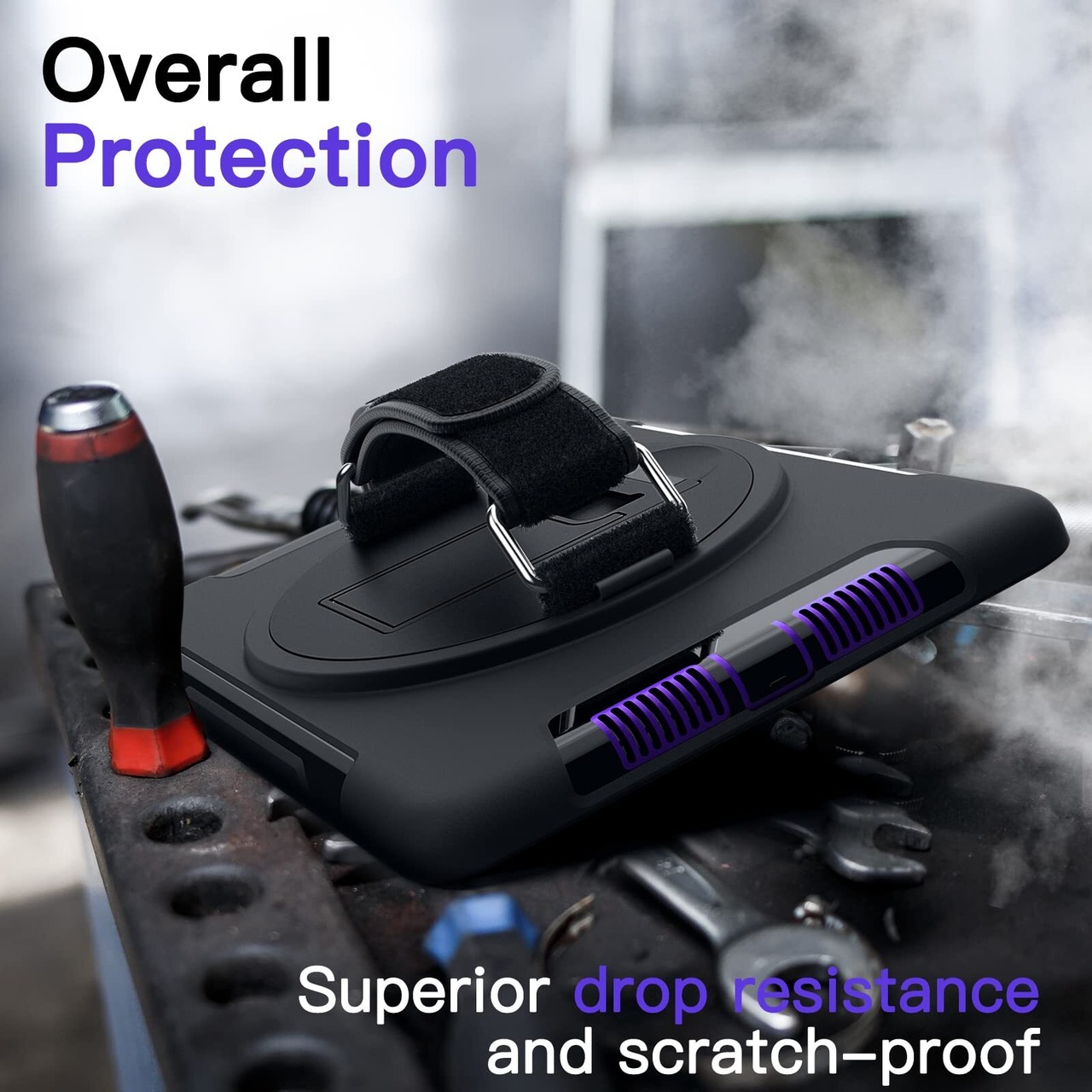 [360°回転キックスタンド & ハンドストラップ] 複数の角度でiPadを簡単にサポートします。さらに、柔らかいハンドストラップにより、iPad をしっかりと快適に保持し、偶発的な落下を防ぎます。お子様は iPaを簡単かつ安全に使って、勉強したり映画を見たりできます