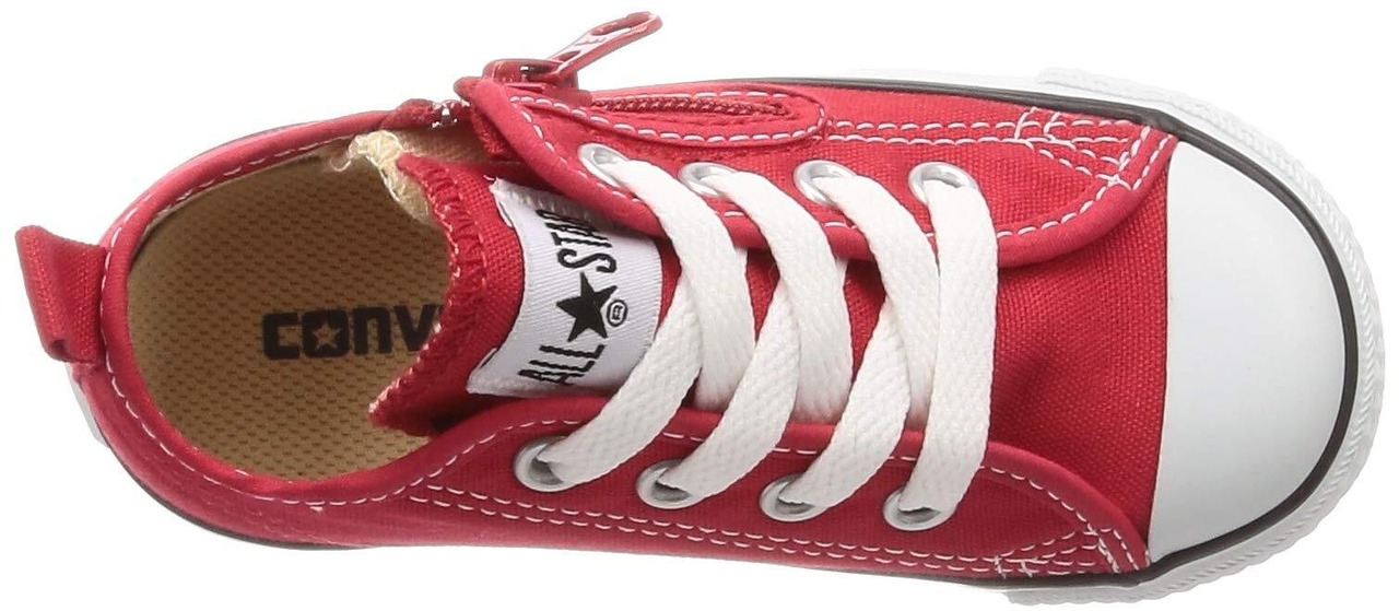 チャイルド オールスター 継続品のリニューアルスペックモデル。持ち手の大きいファスナーに、つまみやすい広めの踵テープで脱ぎ履きしやすい仕様。しなやかなラバーに、踵部分にはボードを内蔵し、足の曲がる位置でしっかり屈曲するソール設計。カップインソールにはサイズ変更の目安が分かるフィッティングチェッカー付き。待望のオプティカルホワイトを追加