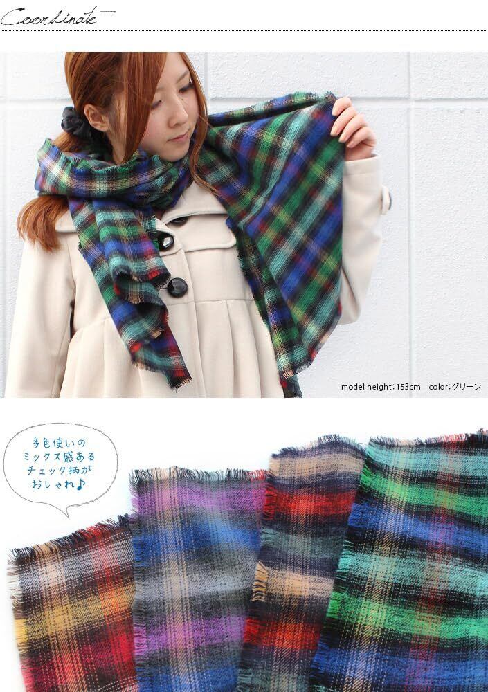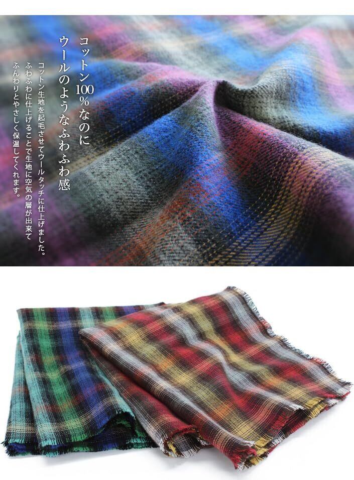 [ヒオリエ] 日本製 チェックストール 両面起毛 コットン100% マフラー 大判