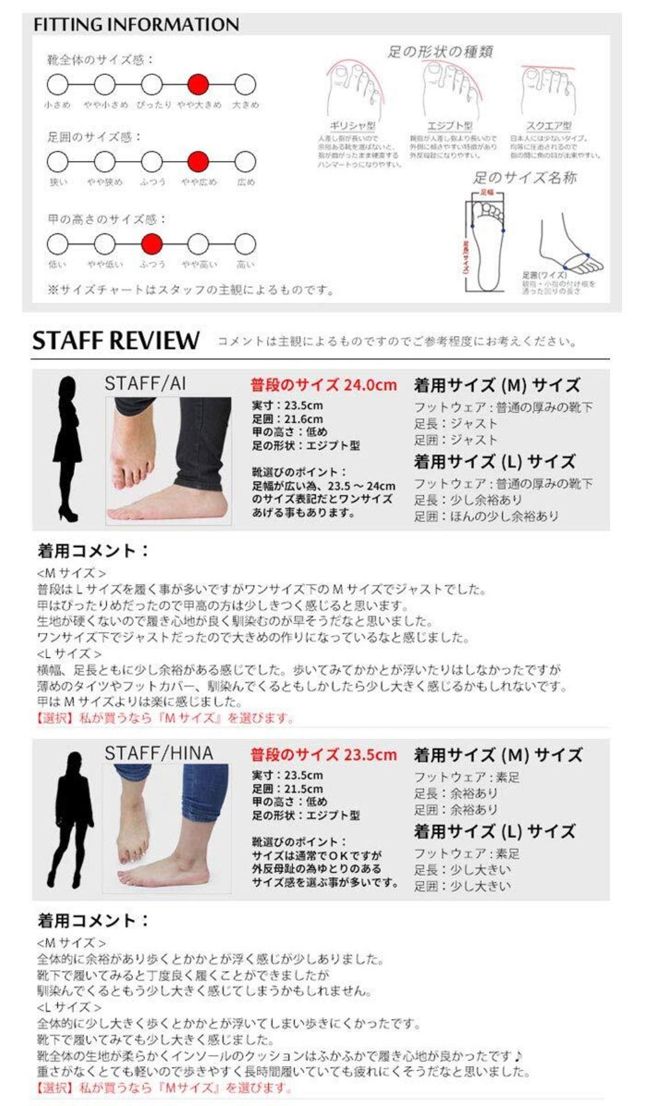S(22.5~23cm相当),M(23~23.5cm相当),L(23.5~24cm相当),LL(24~24.5cm相当),3L(24.5~25cm相当) ※サイズ感はスタッフコメントを参考にしてください。
