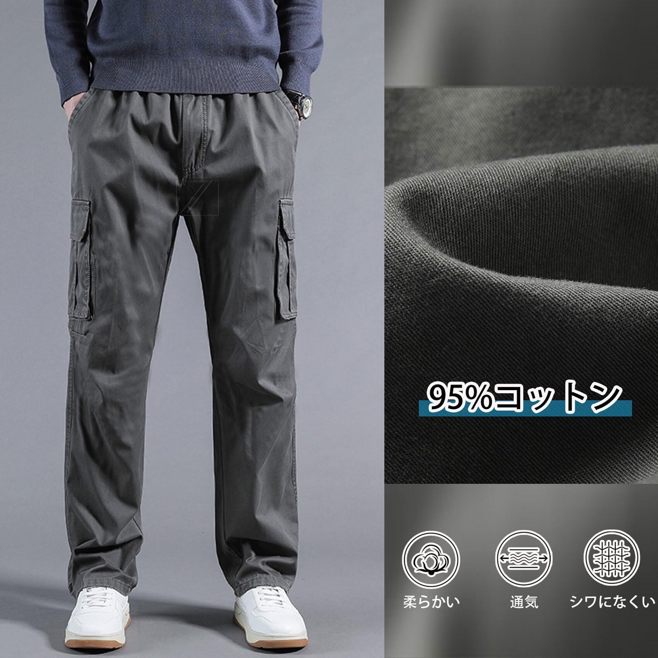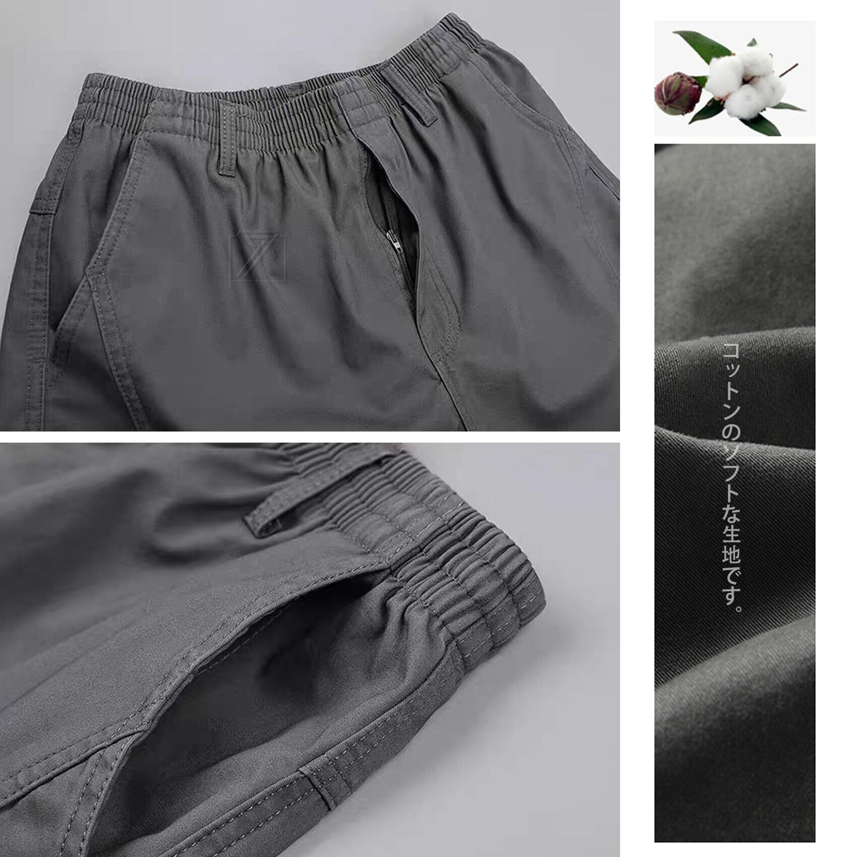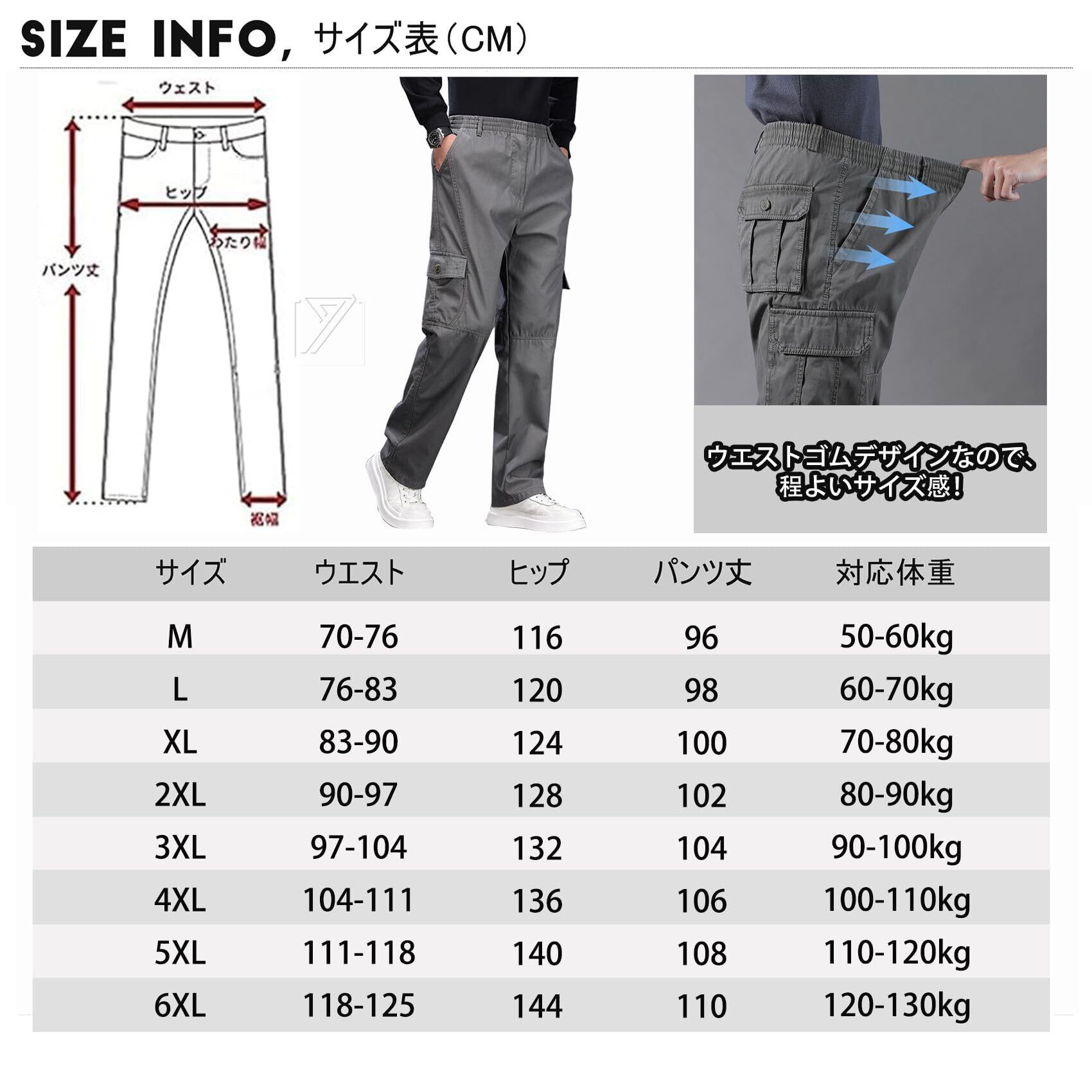 [大きいサイズカーゴパンツ] ゆったりしたデザインなので、ウエストゴムがあって窮屈感が全然なくて、動きやすく、シルエットラインがカジュアルなカーゴパンツ雰囲気を演出します。オールシーズン使える標準な厚みの生地を使用しております。コットン95%のタフな生地です。グリーン、グレー、黒の定番カラーを肌馴染みよく美しく見えるように厳選します。